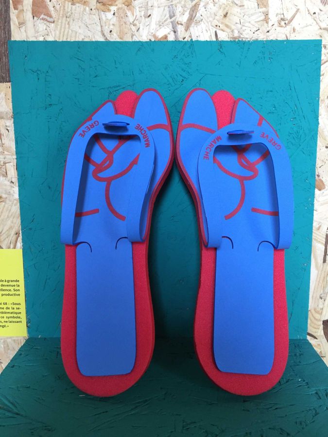 Faisant écho au célèbre slogan “Sous les pavés, la plage”, cette paire de tongs est associée à la figure du poing levé, emblème de la révolte. Pieds et mains se retrouvent liés, ne laissant plus d’autre choix que de prendre congé.