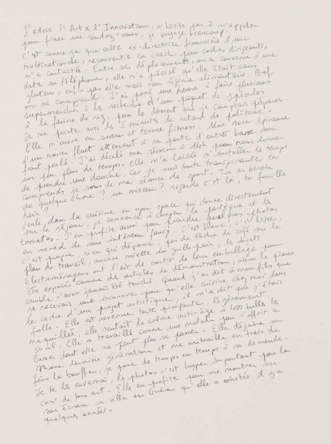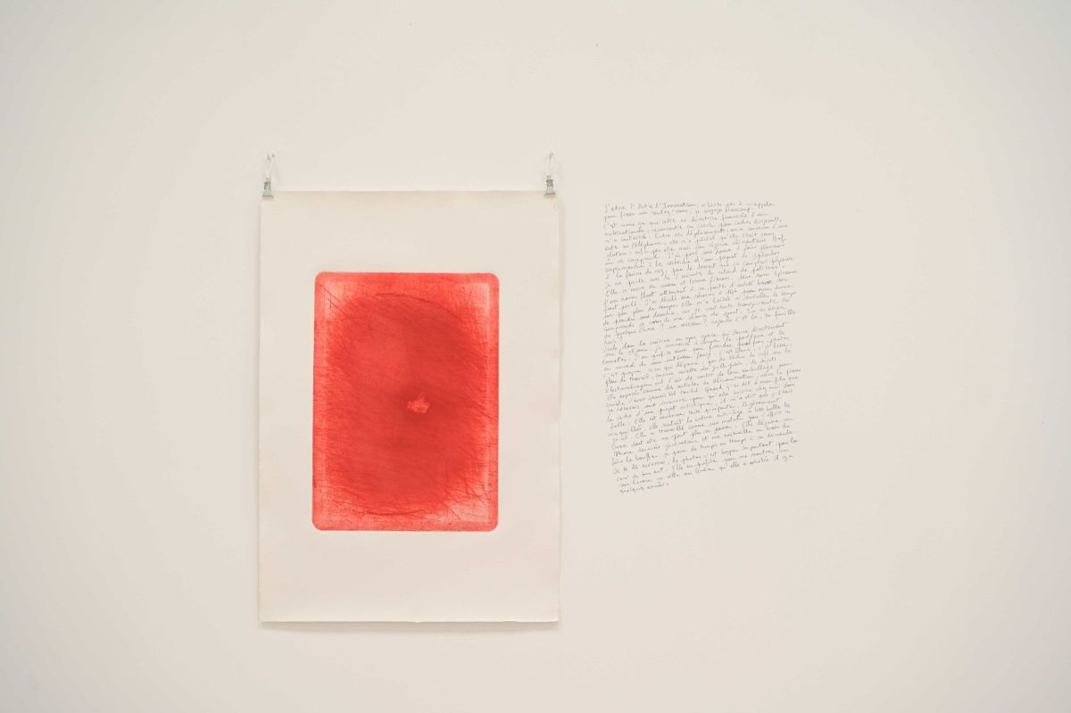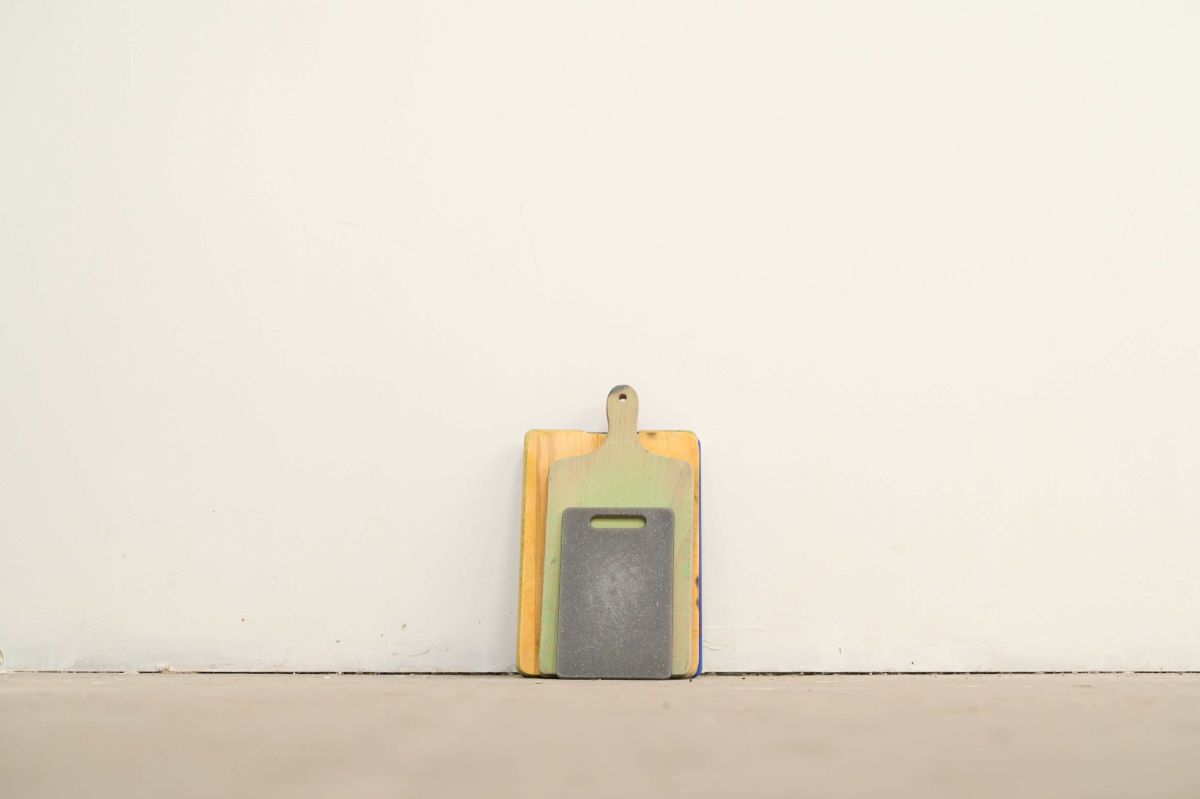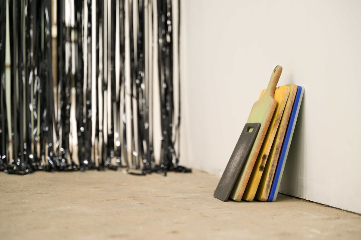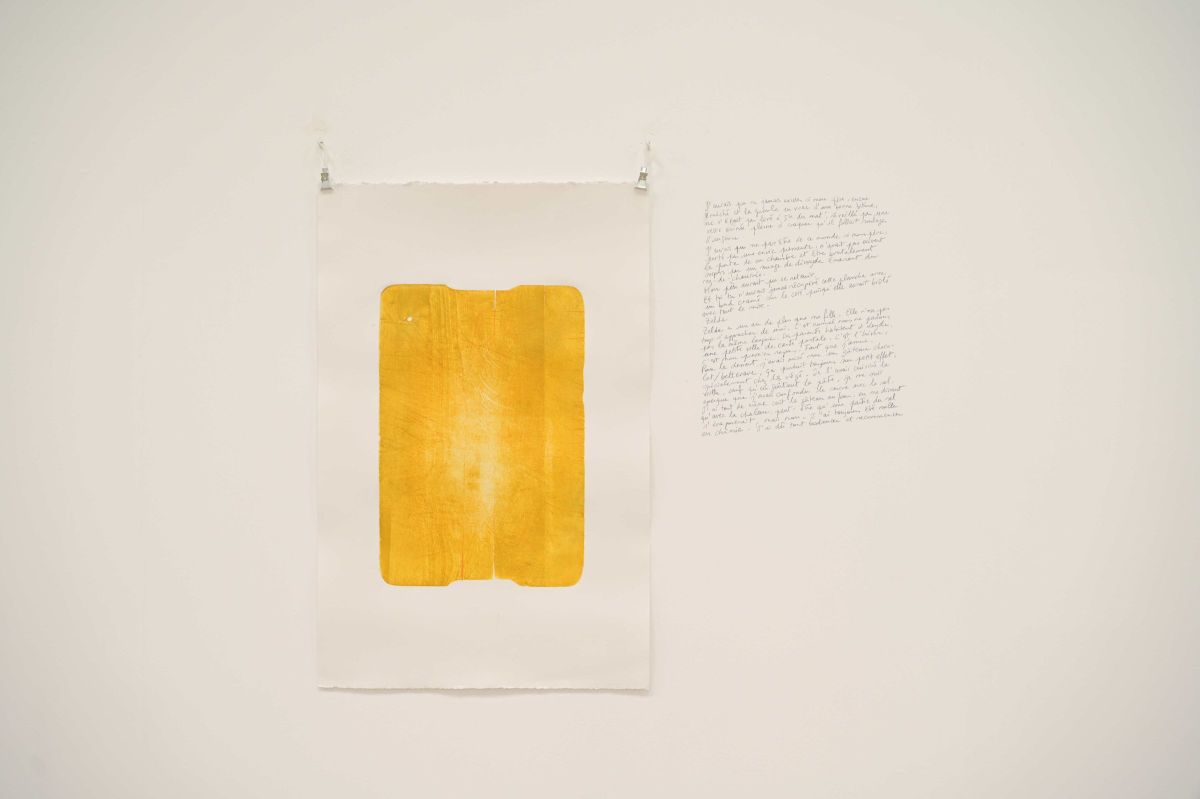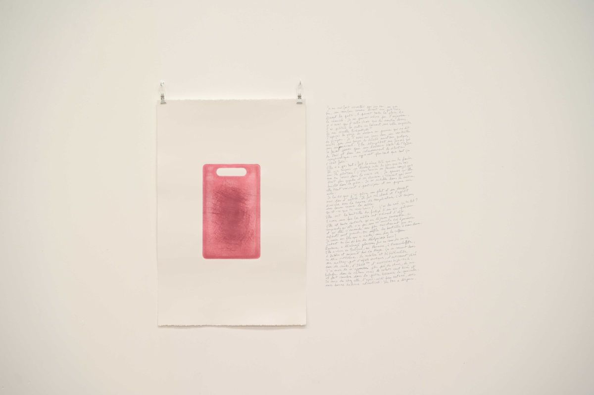 L’installation The final cut est le fruit d’une performance réalisée lors d’une résidence à La Haye consistant à m’inviter chez des particuliers en leur proposant en échange d’un repas que j’offre et cuisine sur place, qu’iels me donnent leur planche à découper de cuisine. À partir de celle-ci j’en tire une matrice afin de révéler les entailles comme des cicatrices au soleil. Des récits tirés de ces temps de repas et écrits à la main à même le mur, sont associés à cette série de planches imprimées.