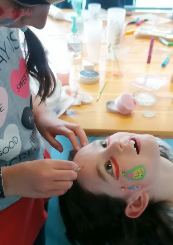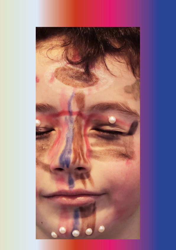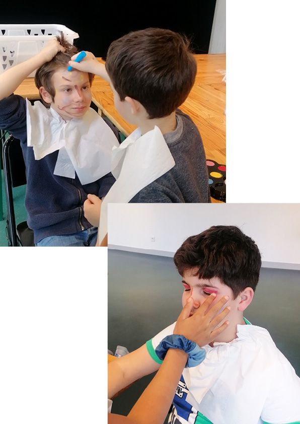Pour cet atelier, je propose aux enfants de maquiller l’autre. Dans un jeu d’altérité, il s’agit d’employer le maquillage comme outil de (re)construction. Comment réinvestir le visage, cette partie du corps, dont nous a dépossédé et privé la crise sanitaire ? En étudiant la topographie et les singularités de celui-ci, cet atelier vise, par le biais du maquillage, à s’emparer du visage comme un espace de transfiguration porteur d’un récit, d’une fiction. À cela s’ajoutent quelques accessoires afin d’augmenter le champ des possibles.