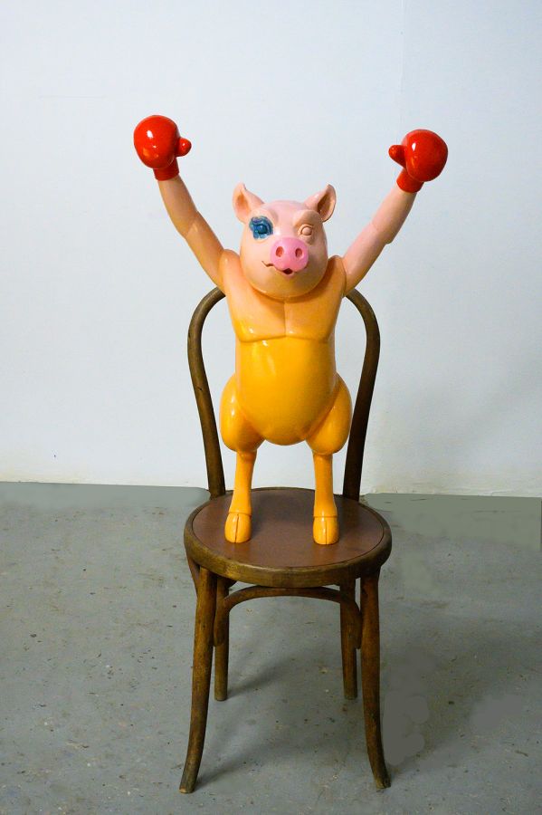 The good-natured look of these figures, the merry colours, based on striking colour contrasts, the jovial nature of the postures, and the precision of their features, so finely observed, all that also conjures up the imagery of children’s books.  The tranquil menagerie of tender years and the merry-go-round, as enchanting as it is intriguing.  The surprising nimbleness with which they are made illustrates an almost anachronistic know-how and, at the same time, it evokes the mimicry of figures in wax museums.  These creatures are in fact so alive and realistic that you would think they are the result of an observation of man that is so keen that it ends with a depiction that is more than nature, with the animal here becoming the acute form of a clinical vision of the state of human beings.