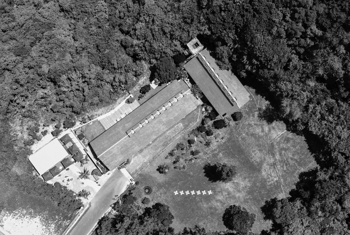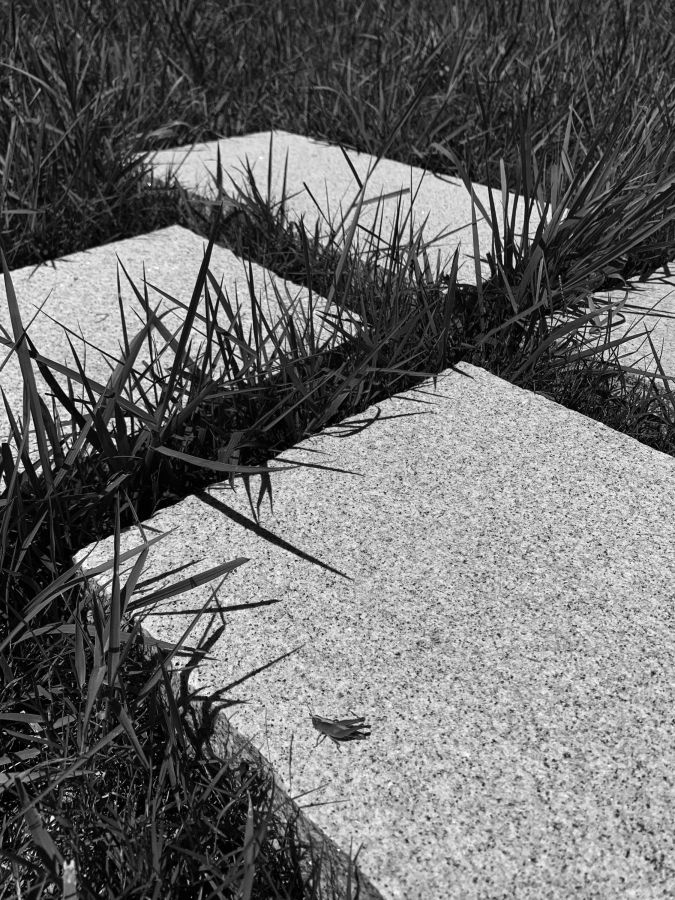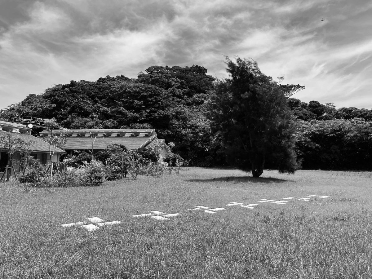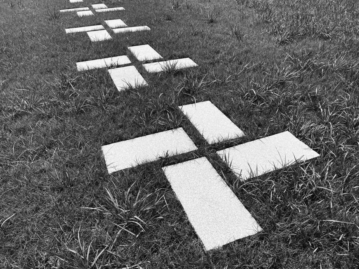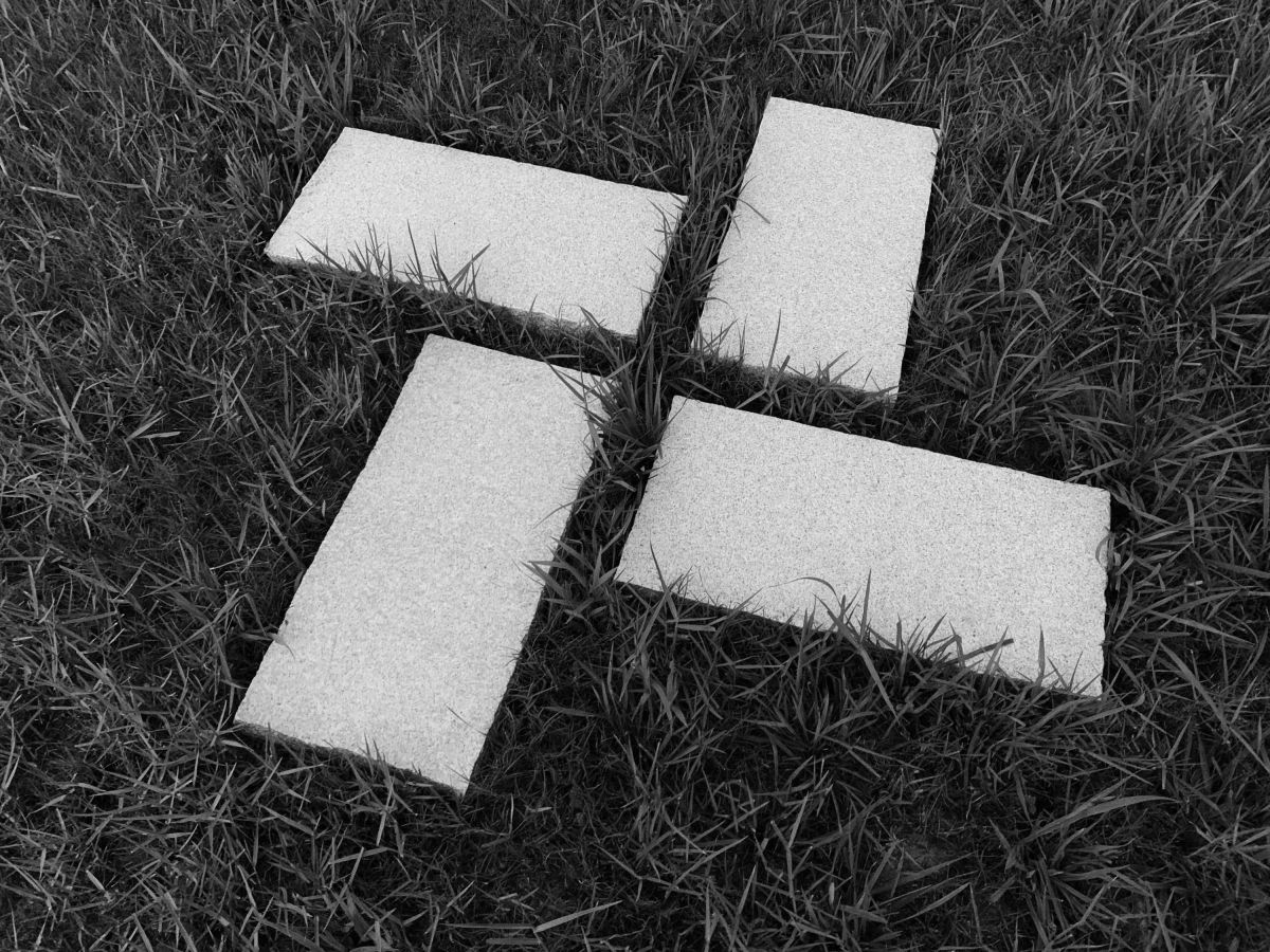 Installée dans le parc du Nanjo Art Museum sur l’île japonaise d’Okinawa, Holzwege se compose d’un ensemble de sept croix en granit gris1 disposées en escadrille, suivant un même axe. Un segment de chemin, sans début ni fin, créé au milieu d’une étendue herbeuse non loin d’un sanctuaire Sēfa-utaki, site sacré du royaume de Ryūkyū. Un segment de chemin qui ne mène nulle part, réfléchi au regard de la topologie et de l’architecture environnante.
