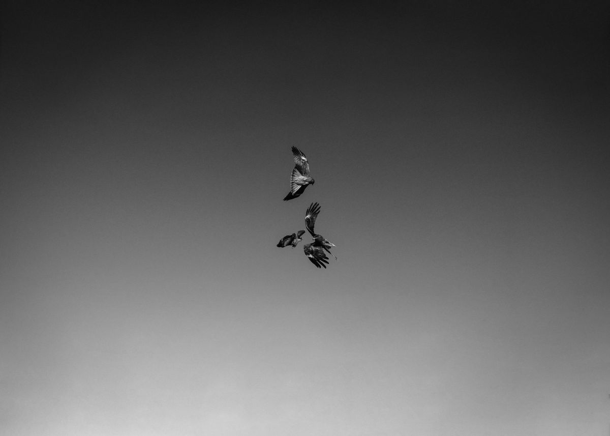 Prise sur la plage de Kamakura, au Japon, à l’hiver 2020, cette photographie est une image prise sur le vif montrant trois oiseaux de proie sur un fond de ciel immaculé. La contre-plongée de la prise de vue s’équilibre avec la dimension potentiellement plongeante d’un escadron de trois milans noirs.
