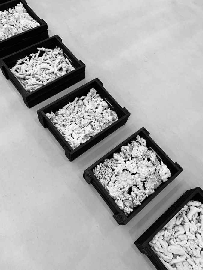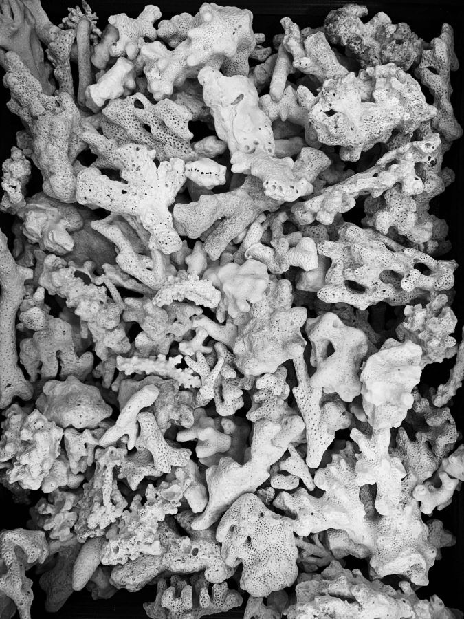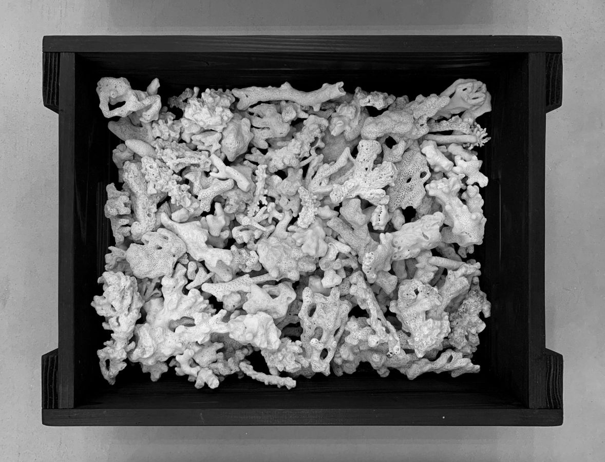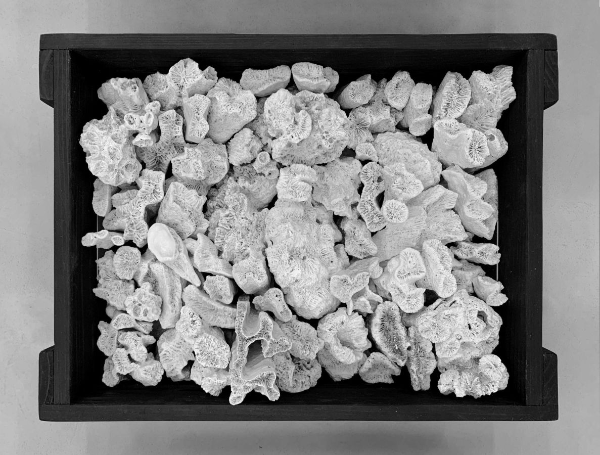 Récupérés, assemblés et classés, des coraux morts reposent silencieusement dans de mystérieuses boîtes. Certains sont transpercés de tiges de métal, évoquant quelque chose en rotation à l’intérieur d’un mécanisme ancien, tel celui d’une horloge ou d’un automate.