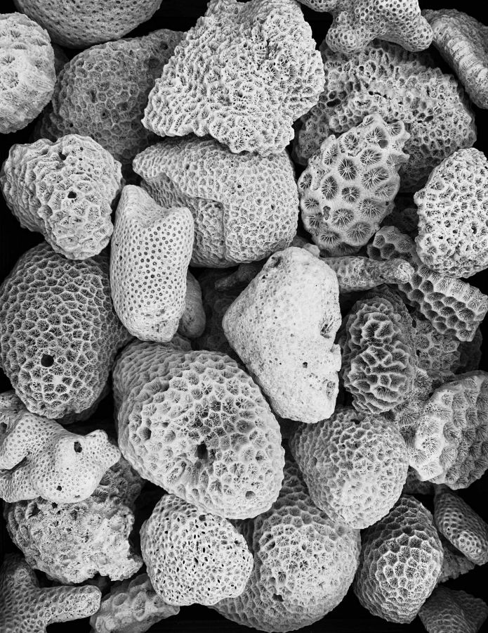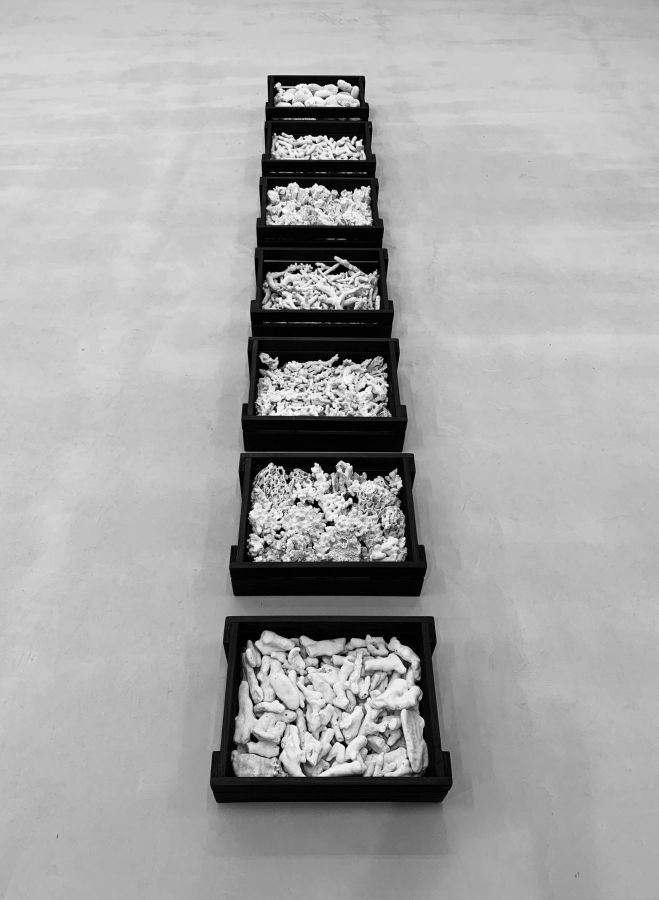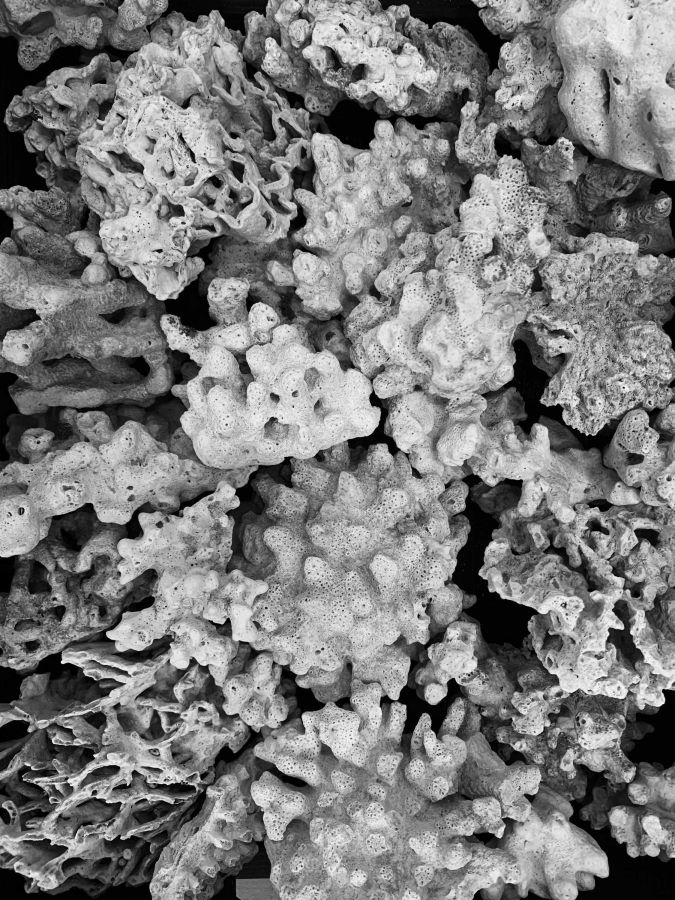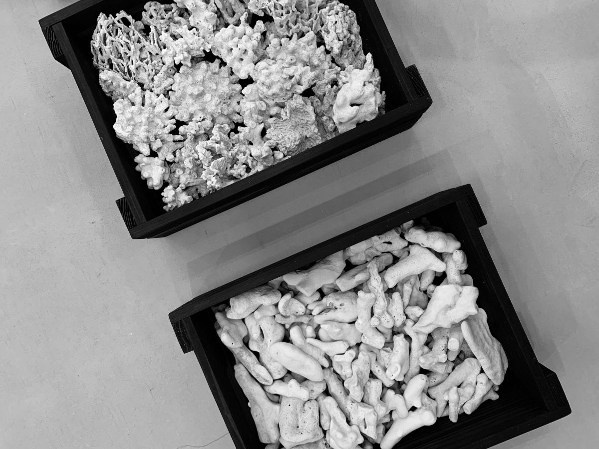 Récupérés, assemblés et classés, des coraux morts reposent silencieusement dans de mystérieuses boîtes. Certains sont transpercés de tiges de métal, évoquant quelque chose en rotation à l’intérieur d’un mécanisme ancien, tel celui d’une horloge ou d’un automate.