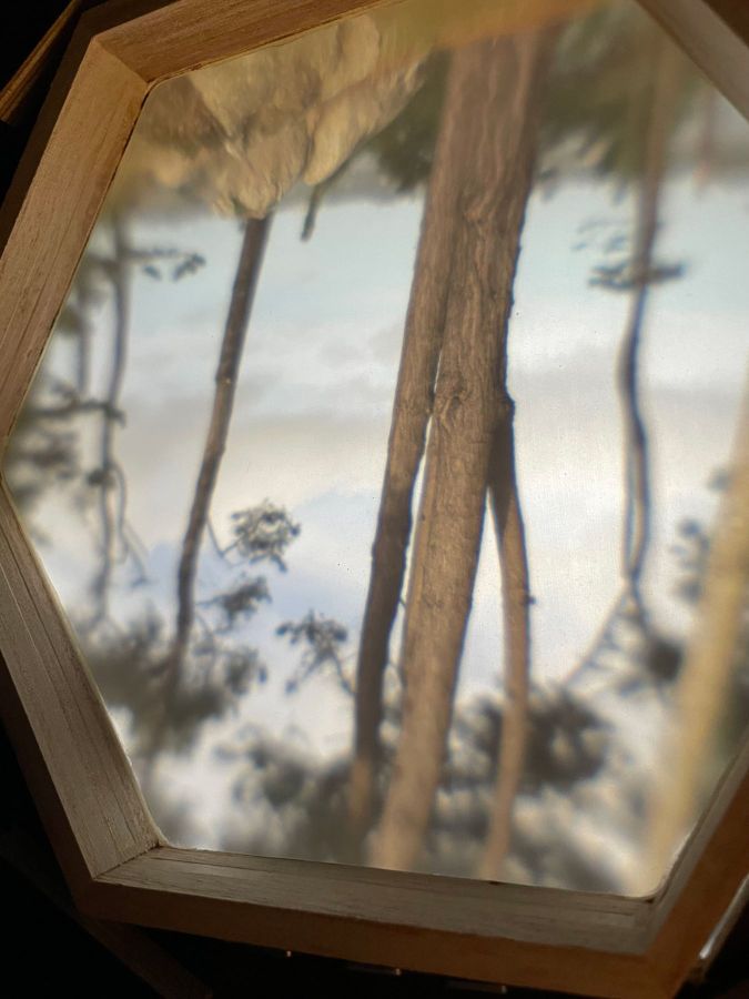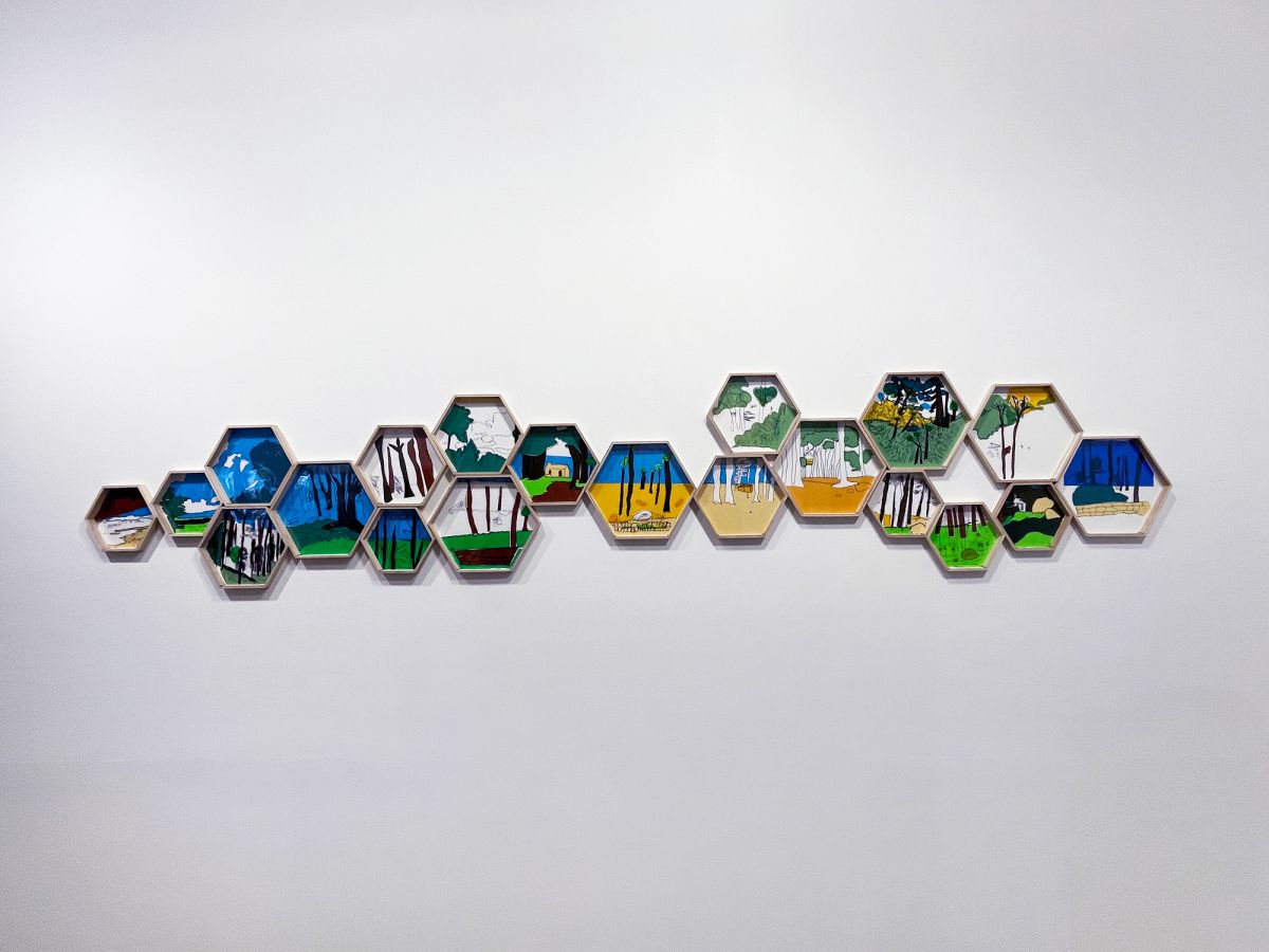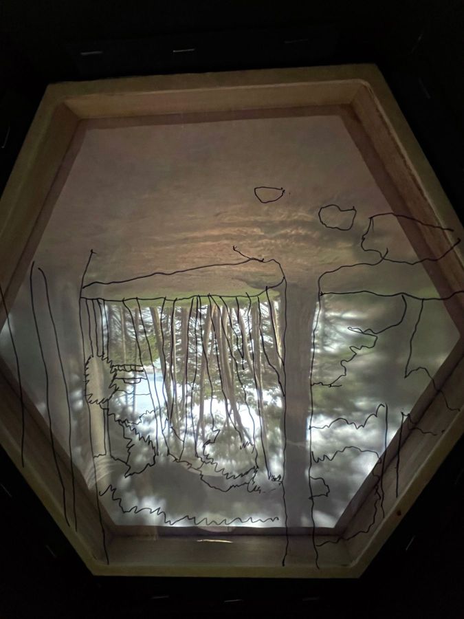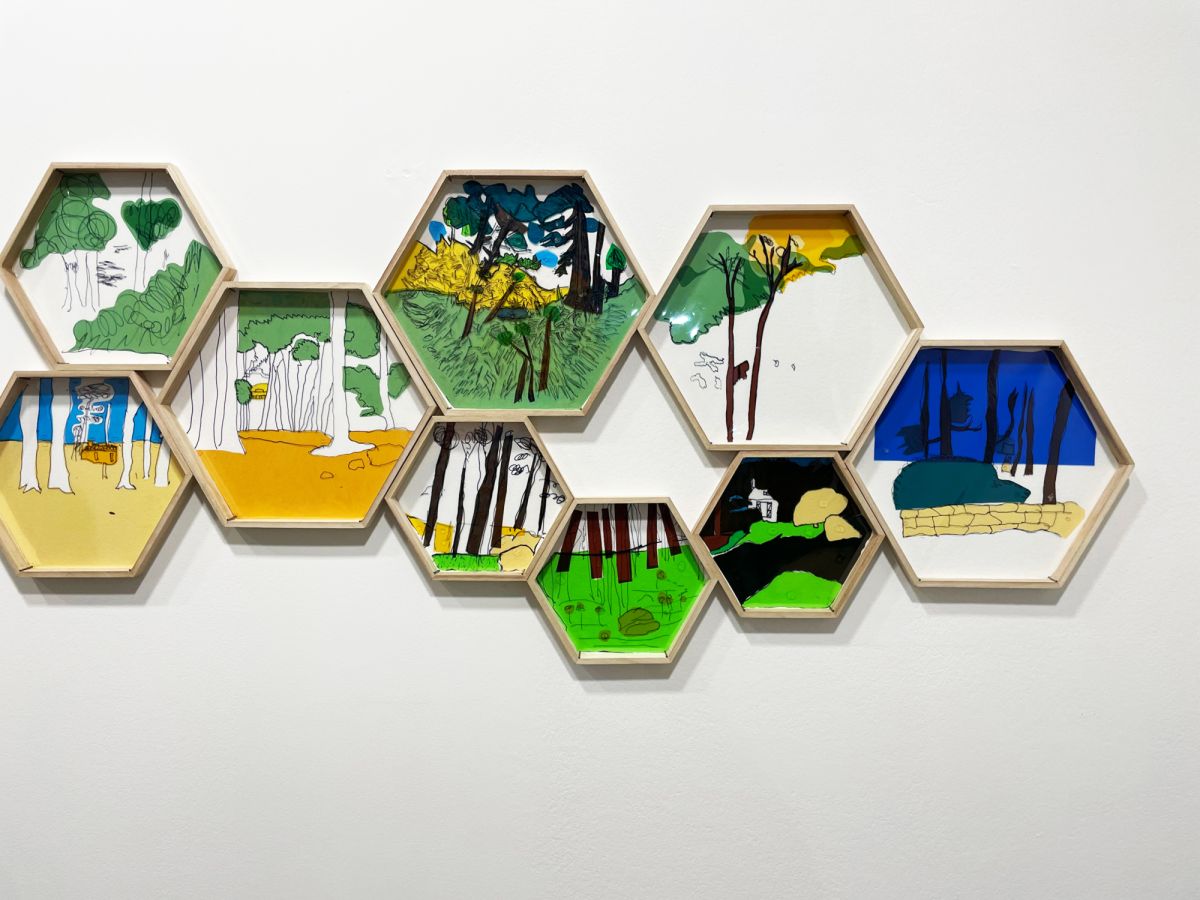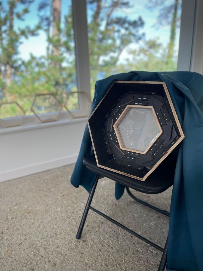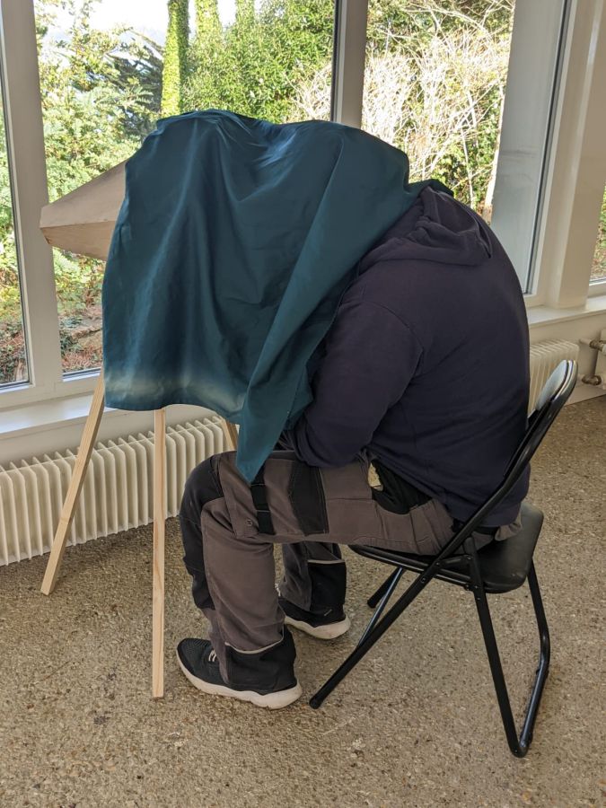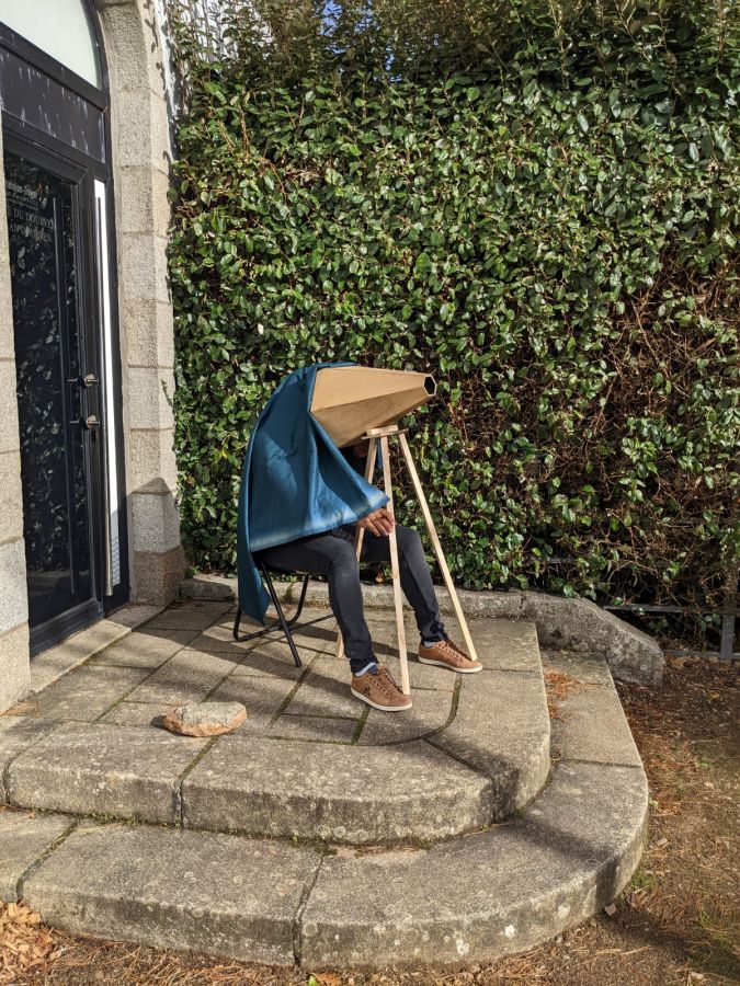 Des chambres noires construites spécifiquement et accueillant des chassis de dessins étaient données aux participants. Il pouvait dès-lors naviguer dans le périmètre proche et s’aider de cette camera obscura pour dessiner à même les châssis hexagonaux le paysage qui se projetait sous le drap noir. Puis, invités à la manière de vitraillistes à venir réhausser ce dessin de couleurs, l’ensemble des fragments de paysages ont par la suite été collectivement recomposés pour créer un panorama semi-fictif.