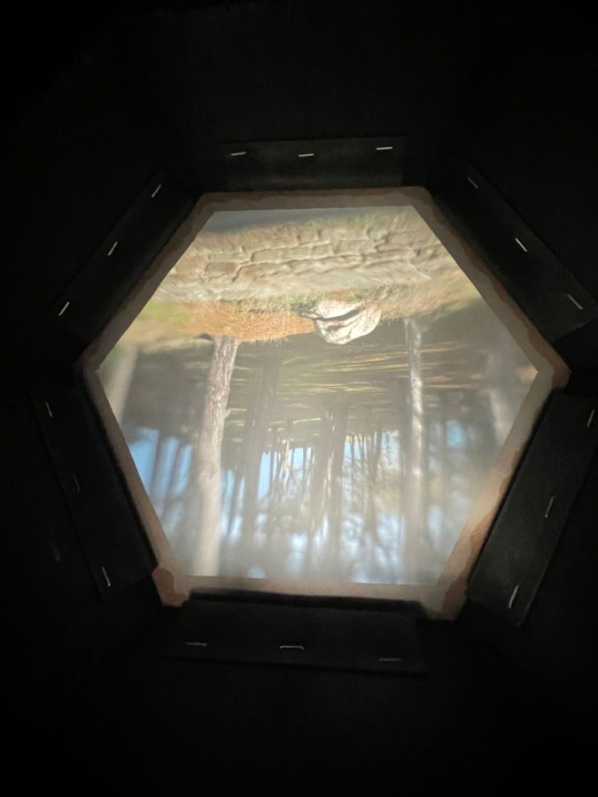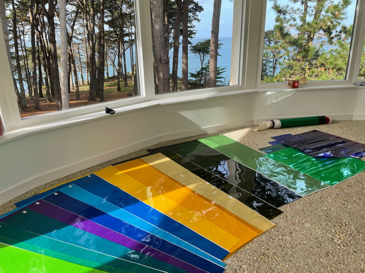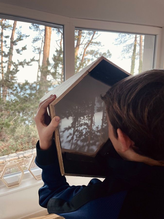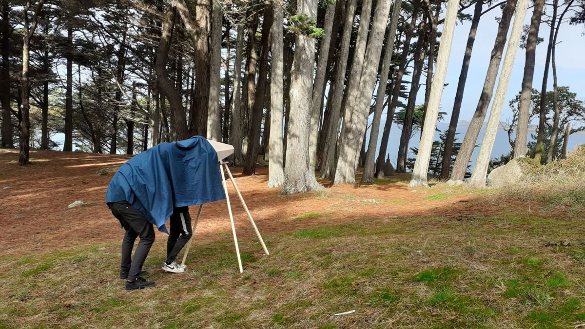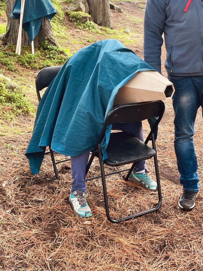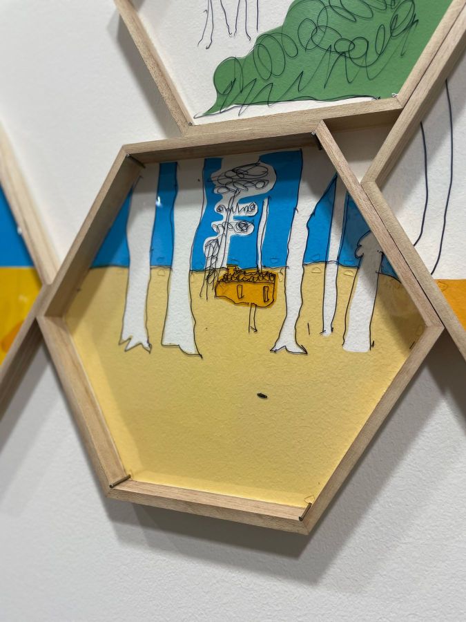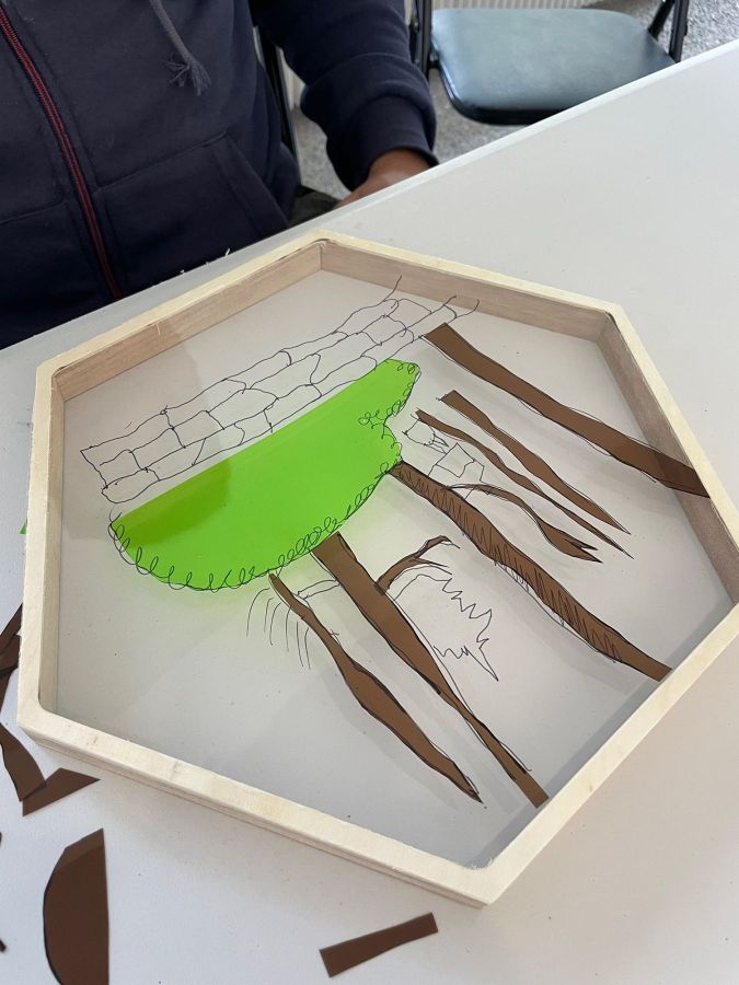 Des chambres noires construites spécifiquement et accueillant des chassis de dessins étaient données aux participants. Il pouvait dès-lors naviguer dans le périmètre proche et s’aider de cette camera obscura pour dessiner à même les châssis hexagonaux le paysage qui se projetait sous le drap noir. Puis, invités à la manière de vitraillistes à venir réhausser ce dessin de couleurs, l’ensemble des fragments de paysages ont par la suite été collectivement recomposés pour créer un panorama semi-fictif.