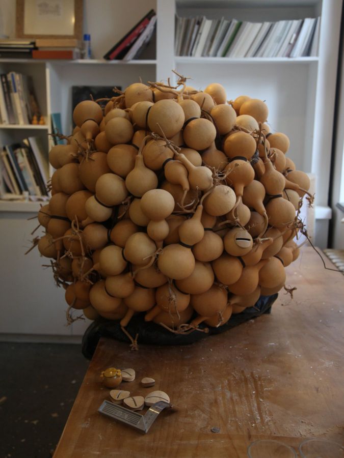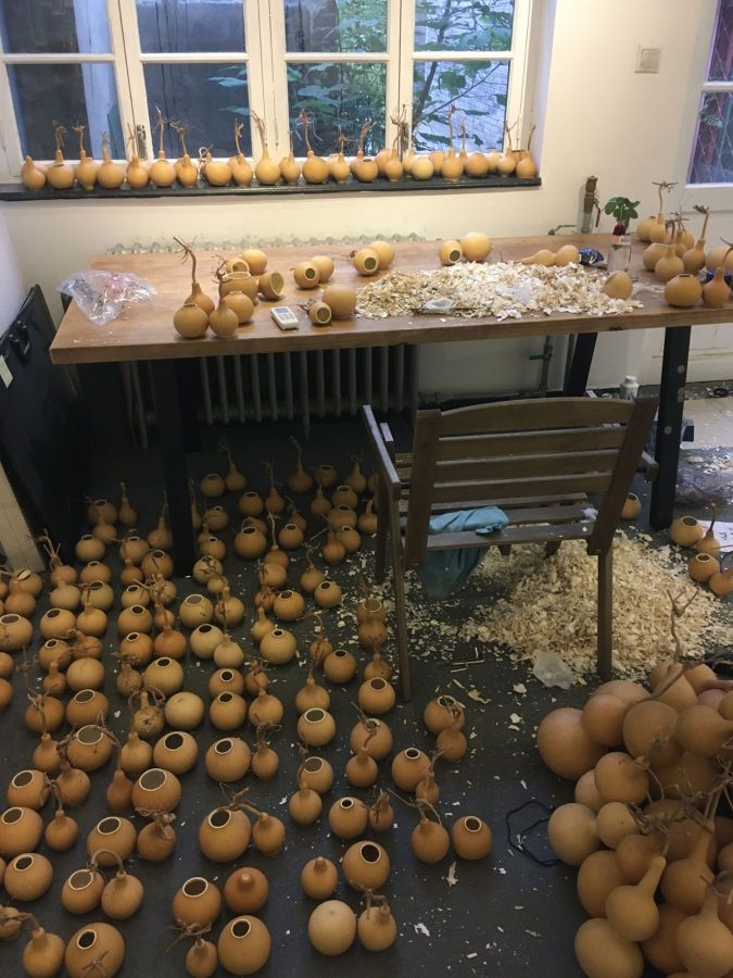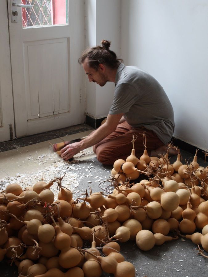 En m’inspirant de la forme de ces anciens sifflets qui traversent l’Histoire, j’ai entamé la construction d’une sculpture sonore composée de centaines de Hulus (courges chinoises). Gezi est une performance filmée, autour du hutong que j’habite en faisant résonner la scultpure sonore positionnée derrière le vélo.