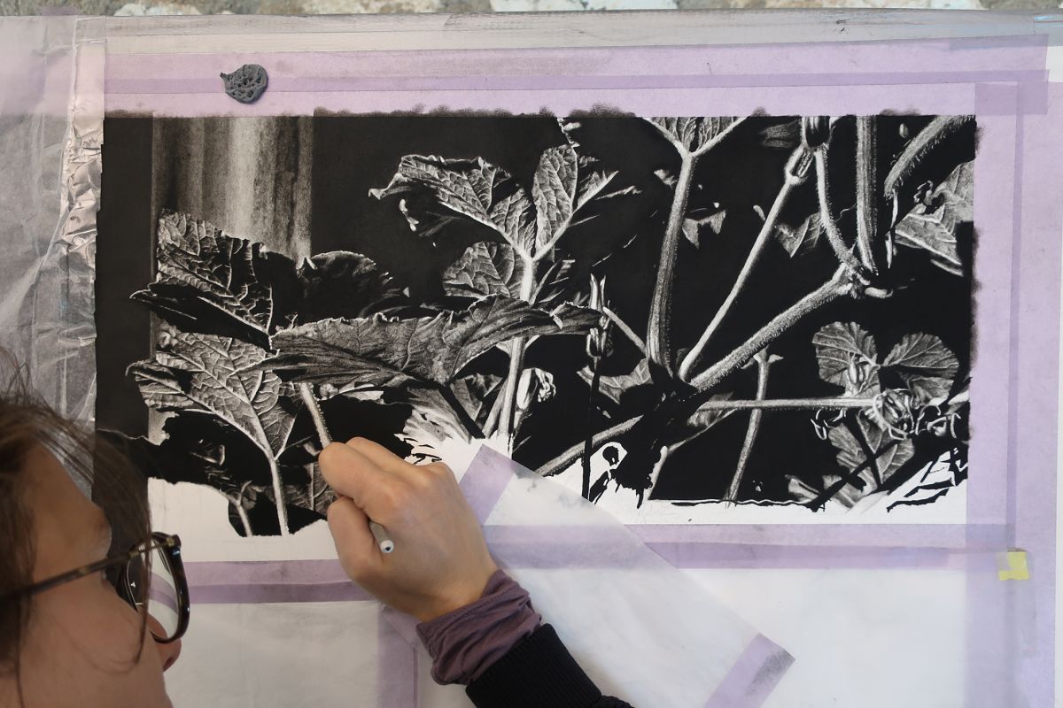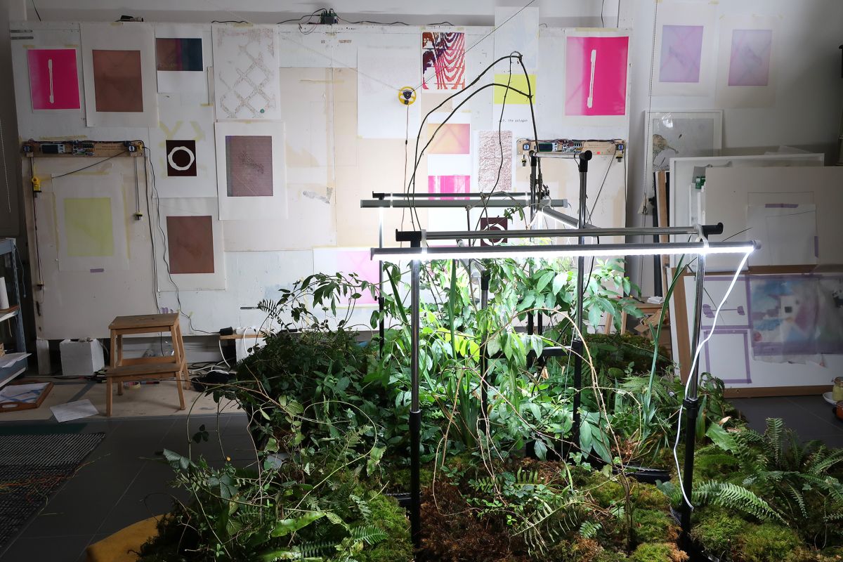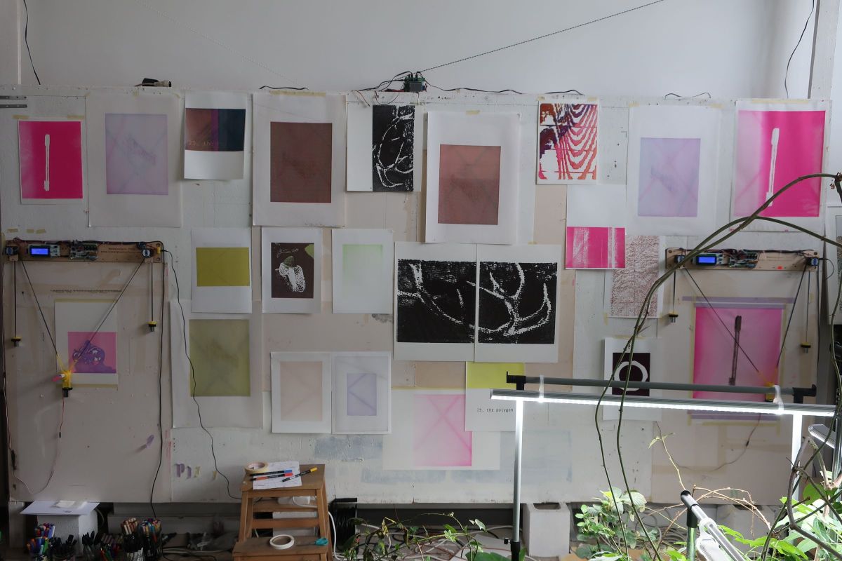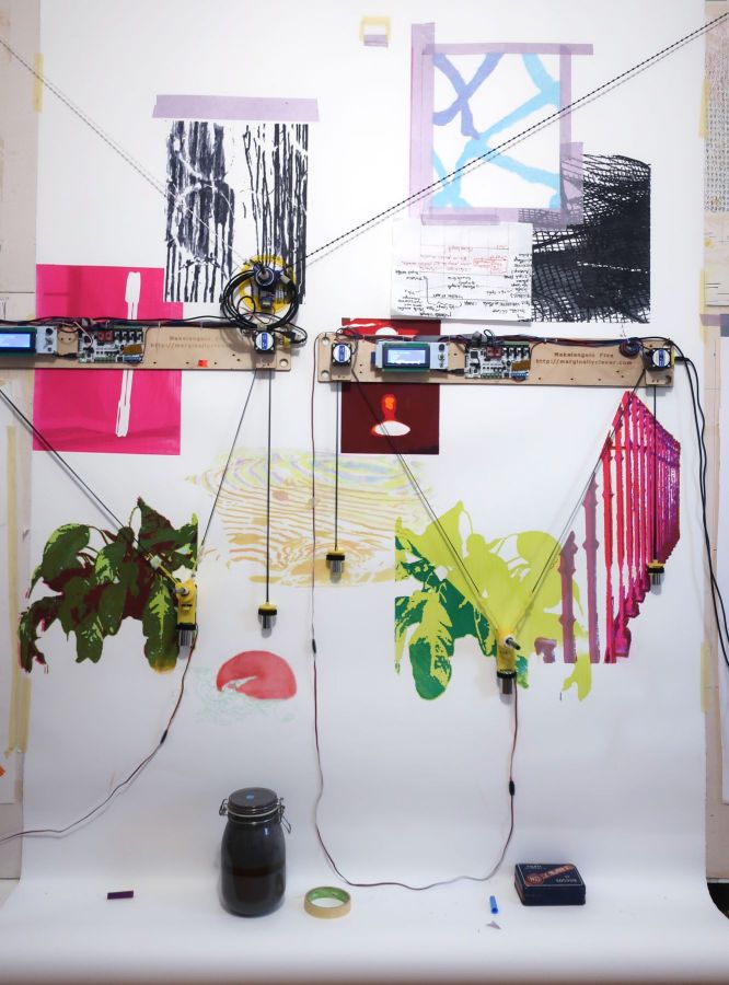 Julie Bonnaud and Fabien Leplae have worked together since 2015 on a body of work that combines drawing, painting, publishing and gardening. Informed by speculative fiction and the philosophy of science, the two artists design form-generating technical devices in their lab-like studio. Their works involve a permanent collaboration between the world of technology – particularly through their use of drawbots (mural trackers that reproduce computer-generated drawings on paper) – and human intervention, and therefore postulate hybridisation as a necessary system for the preservation of life.