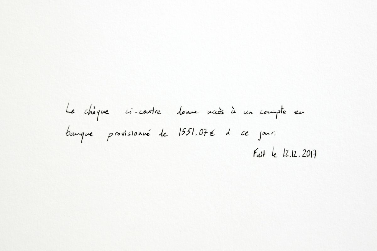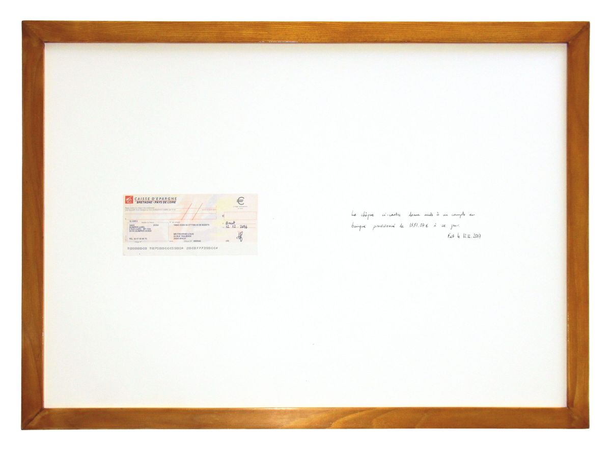 2017Chèque bancaire, encre sur papier, bois laquéDimensions : 50 x 65 cm