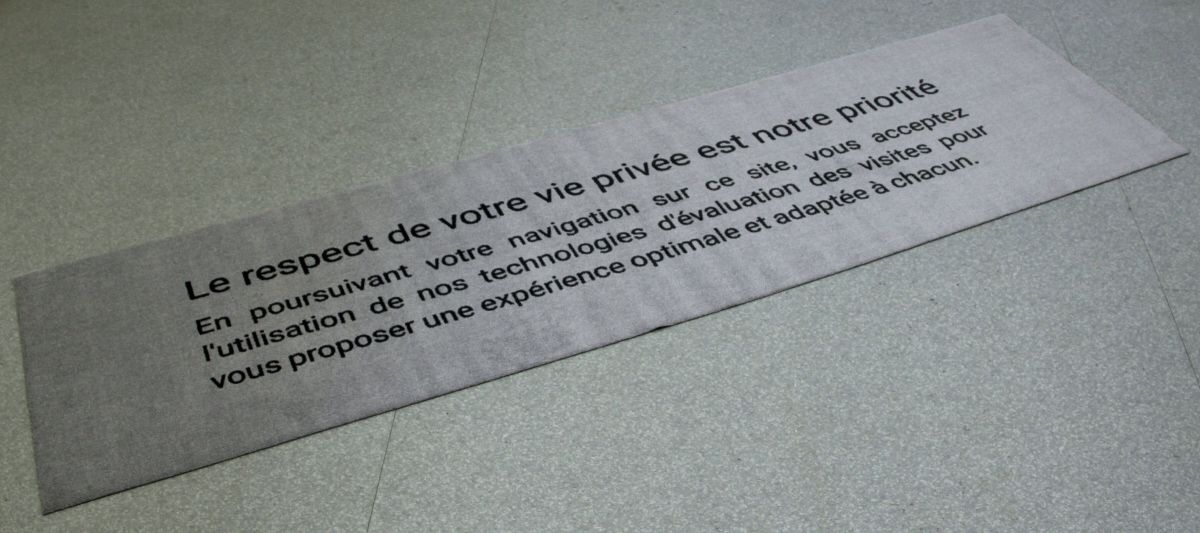 Le respect de votre vie privée est notre priorité, un tapis reprenant les codes graphiques et le phrasé des bandeaux de confidentialités présents sur de très nombreux sites internet, pose la question suivante : Sommes-nous prêts à accepter dans un espace concret ce que beaucoup d’entre nous concèdent déjà dans des espaces virtuels ?