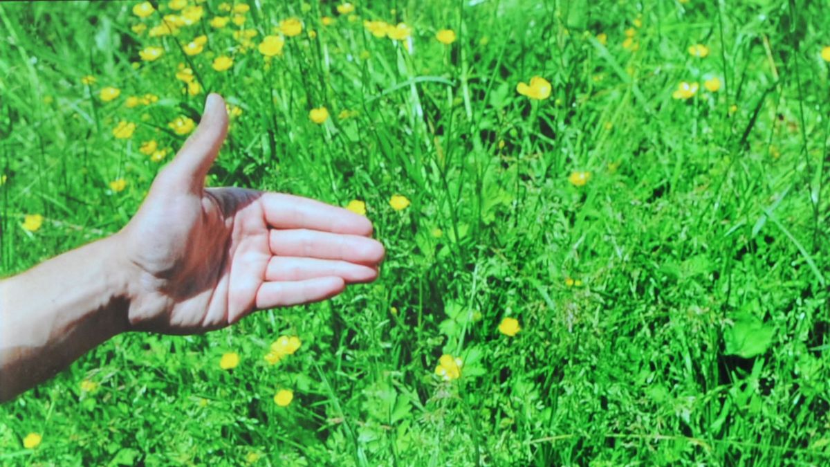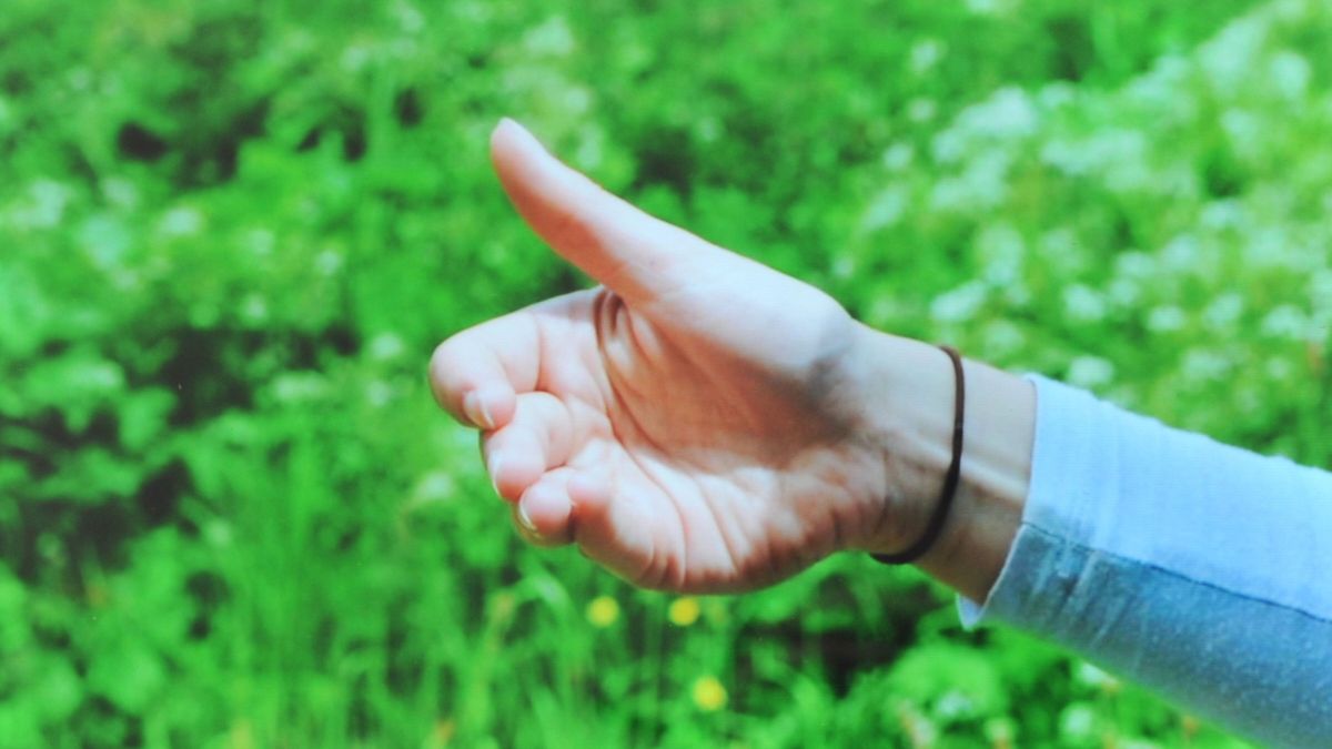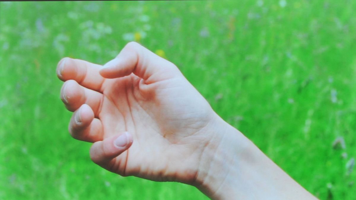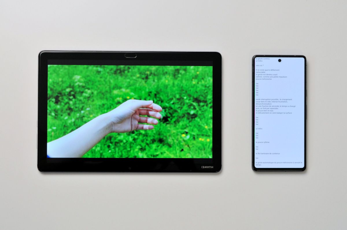 Une vidéo dans laquelle s’enchaînent des mains qui tentent d’effectuer le geste du scroll sans appareil sur lequel appuyer ce geste, accompagnée par un poème défilant à côté.