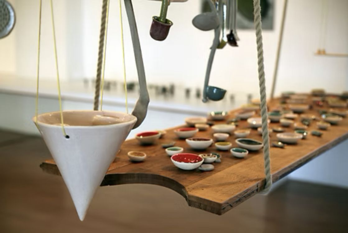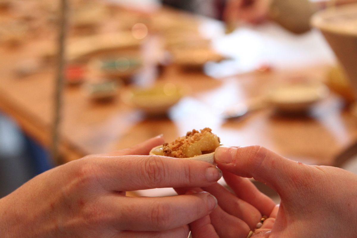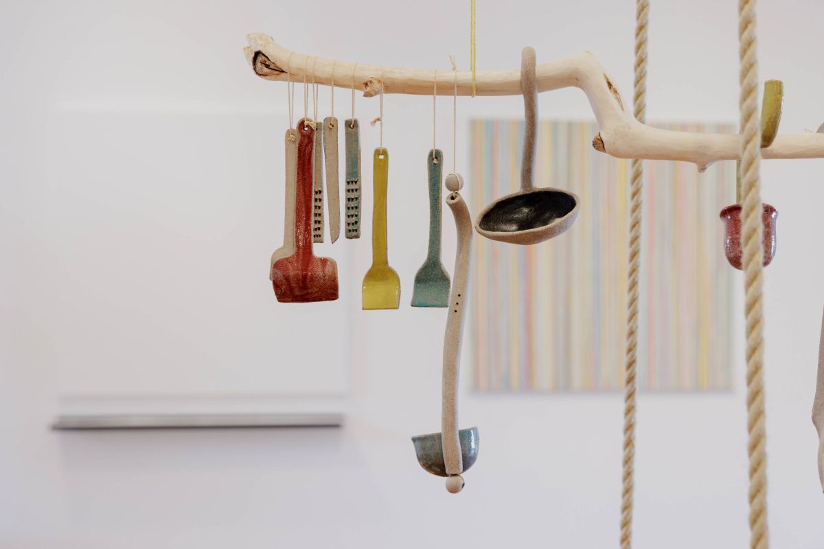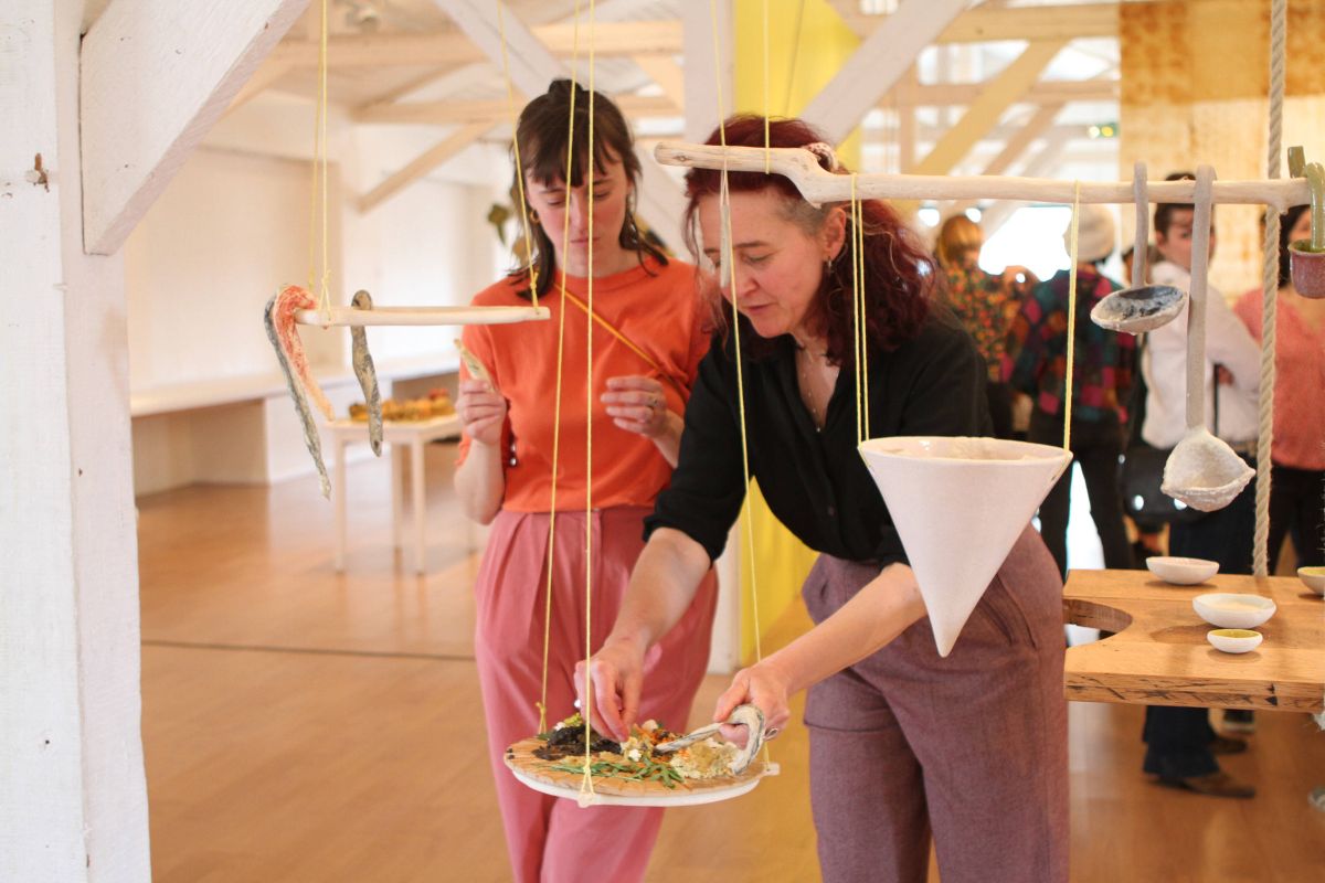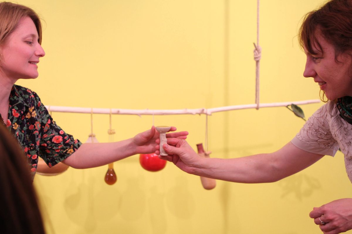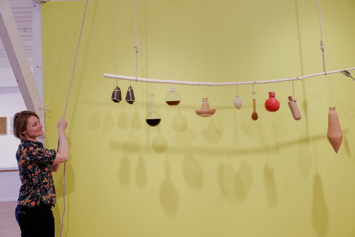 Conçues à 4 mains avec Fanny Maugey, les céramiques (verres, bols, coupelles, outils, bouteilles, suspensions) sont le fruit de plusieurs temps de travail à la Maison des arts plastiques Rosa Bonheur pour l’exposition Faire oeuvre en cuisine. La vaisselle organique, géométrique, ou parfois élémentaire, accueille des préparations culinaires du restaurant In Vino Tapas. Les deux plasticiennes qui habituellement cuisinent elles-mêmes pour leurs