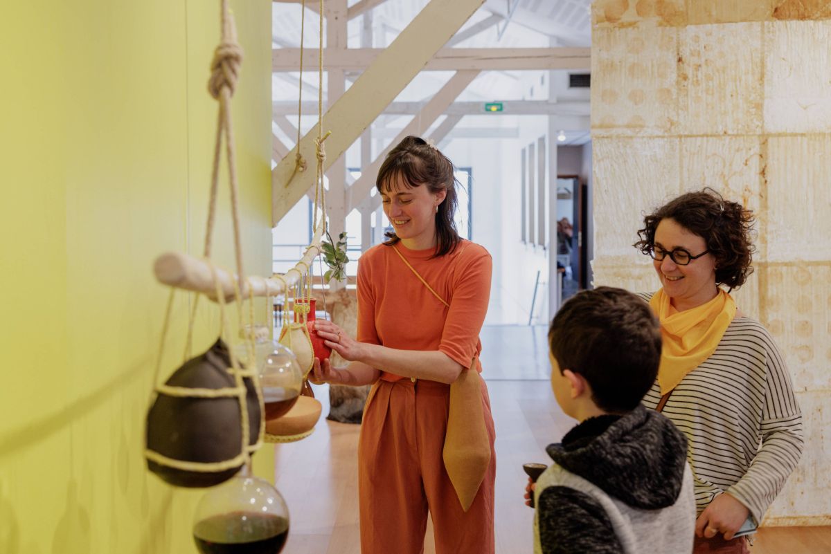 installations, confectionnent des agapes sucrées (chocolat, cailloux volcaniques, gressins) ainsi que des liqueurs, vins et sirops. Le mur mimosa nous fait sortir de l’hiver et appelle un printemps enivrant. Devant lui, une série de bouteilles montées sur poulies se transforment en bar au moment opportun. Le plan de travail suspendu, bien entouré de ses ustensiles, témoigne des gestes et petites préparations passés ou à venir.