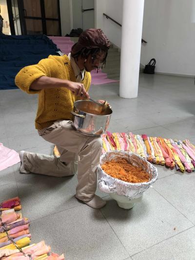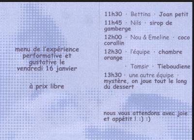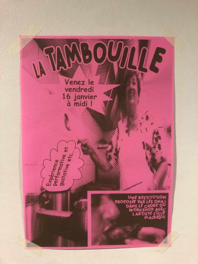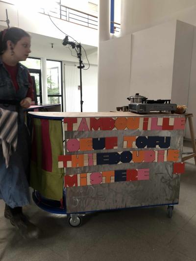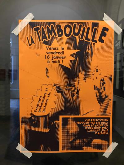 Un déjeuner a été proposé comme restitution. La partition de ce temps performatif a pu mettre en valeur le travail de chaque étudiant·es. Depuis La tambouille poursuit sa route dans les couloirs de l’école et cuisine lors d’évènement pour l’asso des élèves.