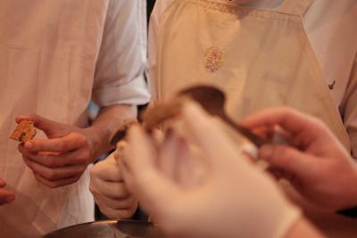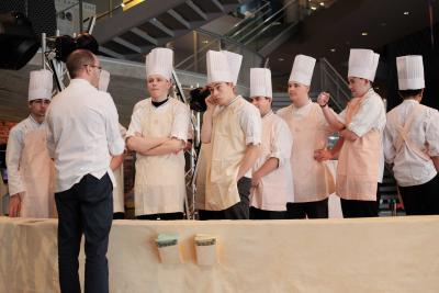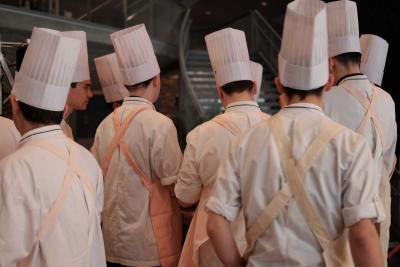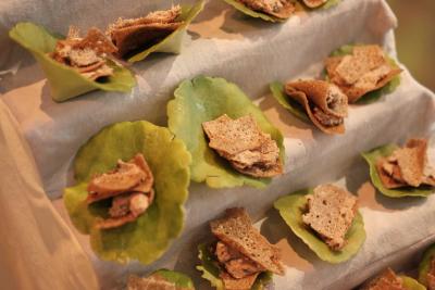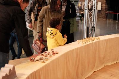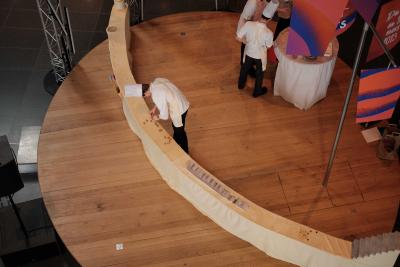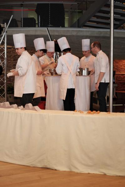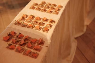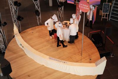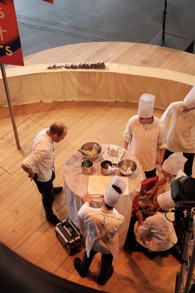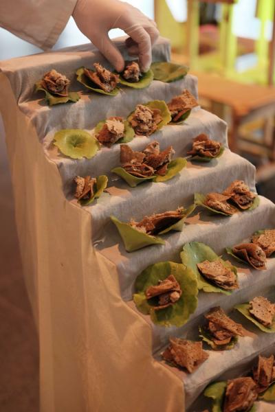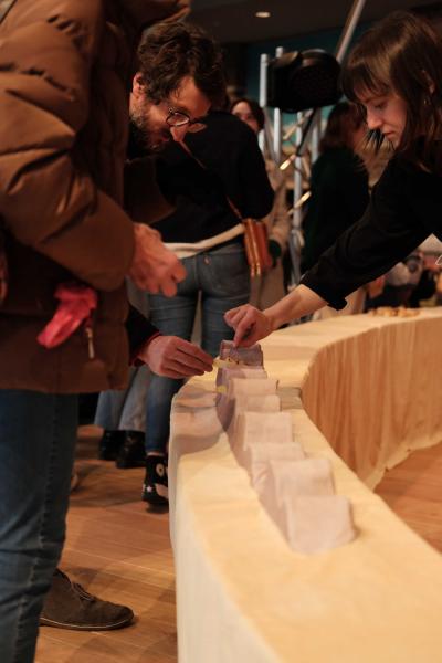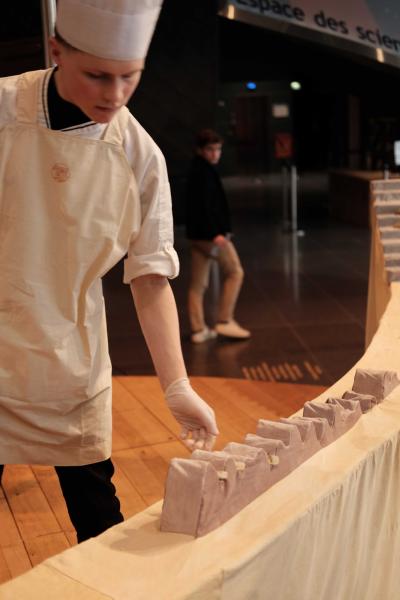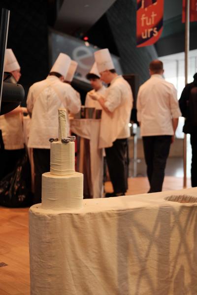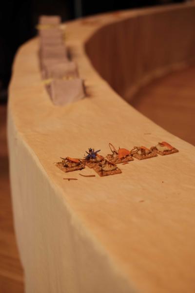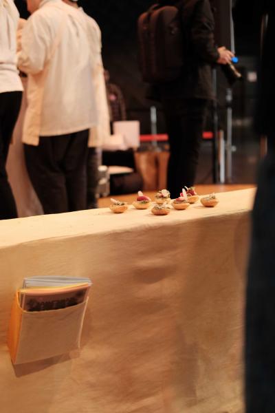 Les Champs libres m’invitaient début 2023 à penser un buffet durable pour le festival Nos futurs. Après plusieurs temps au Lycée Hôtelier de Dinard, nous avons imaginé avec une classe de seconde et leur professeur de cuisine Nicolas Douin, Présence fugace, 6 recettes qui ont été dressées sur la nappe multidimensionnelle de 7m, réalisée pour l’occasion. Ce socle coloré avec des plantes du Finistère a accueilli de nombreuses bouchées, les unes posées sur des ombilicus, les autres cuites dans des berniques ou d’autres encore couronnées de bourraches. La cueillette Bretonne mise à l’honneur dans cette installation fut le point de départ du projet, travailler avec les déchets de la cuisine, également. Sublimé par des produits des environs, nous avons voulu avec Nicolas et ses élèves, rendre accessible des recettes durables et gastronomiques. Un livret les recueillant était disponible pendant l’évènement, précédé d’un entretient avec Anne Baudriller professeure d’économie au lycée hôtelier et assaisonnés des collages fait par les élèves et leur professeure de design Clara Gaget autour des recettes choisies. Les tabliers ont été réalisés par Sophie Colas et brodés à la main avec le logo des élèves.