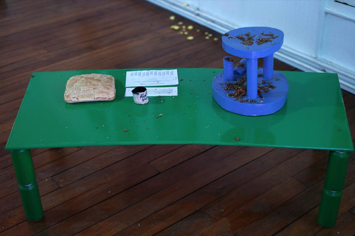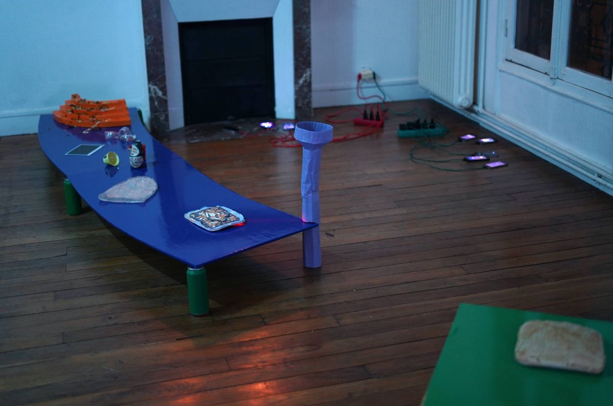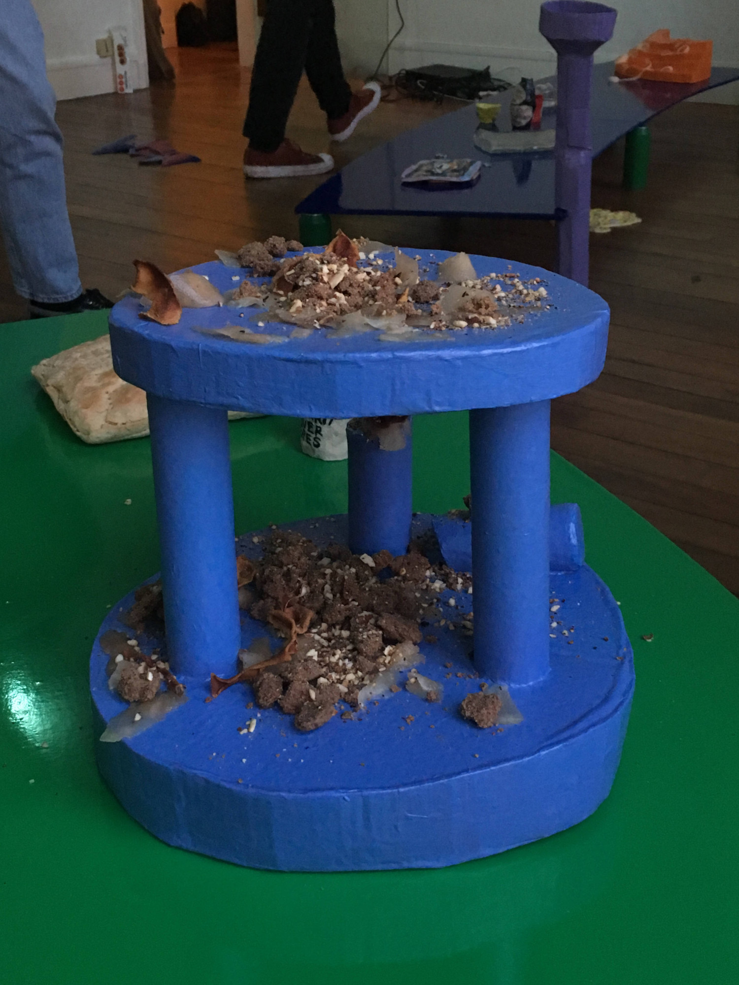 Pour cette exposition collective dans un appartement parisien, je montre des éléments assemblés, des pans de tables de mon diplôme recouvert de venilia, des formes rappelant des ruines architecturales recouverts de ce qui semble être au premier abord des déchets alimentaires. Ces éléments sont la table du vernissage et les amuse-bouche.
