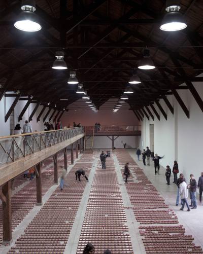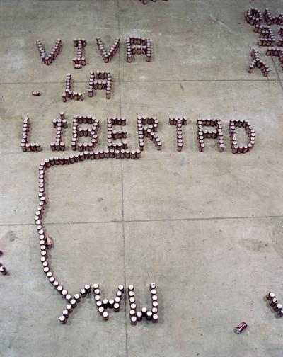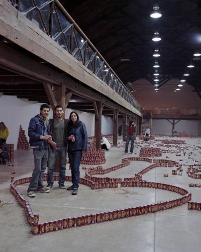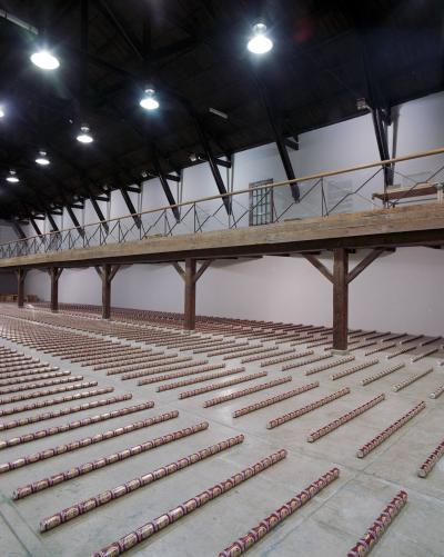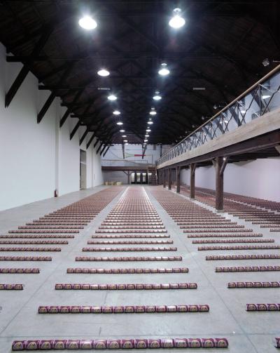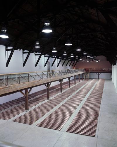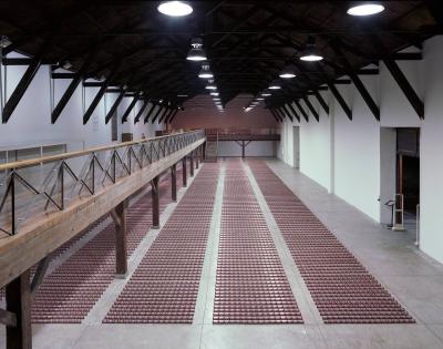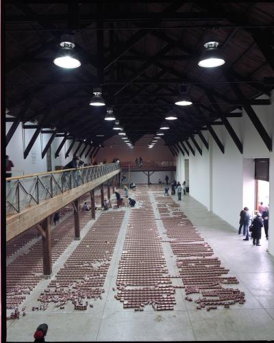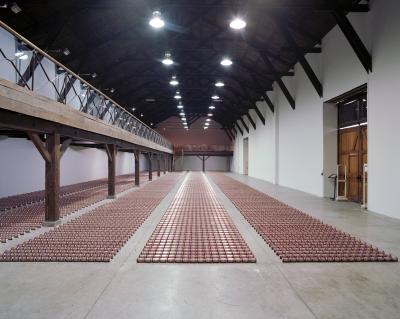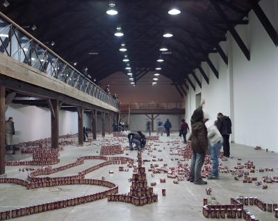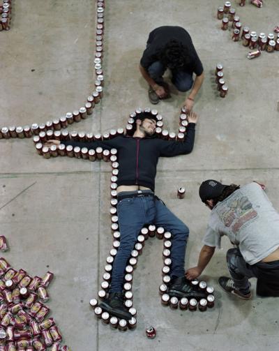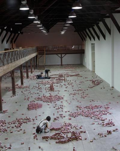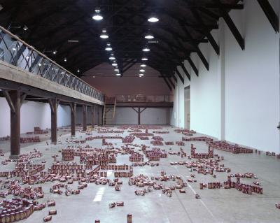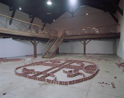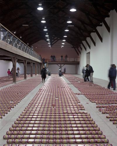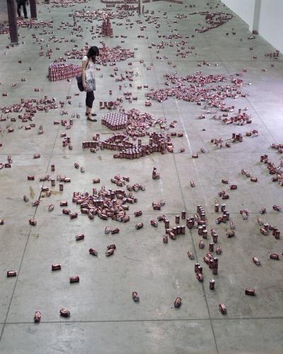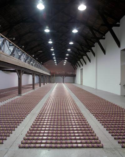 En 1979, le sculpteur américain Walter de Maria réalisa l’installation The Broken Kilometer. La pièce monumentale installée au sol était composée de 500 barres de 2 mètres de long disposées suivant des règles géométriques strictes. Cette pièce a été post-produite avec 6015 canettes de bière et par conséquent transforme l’oeuvre en une sculpture performative et consommable.