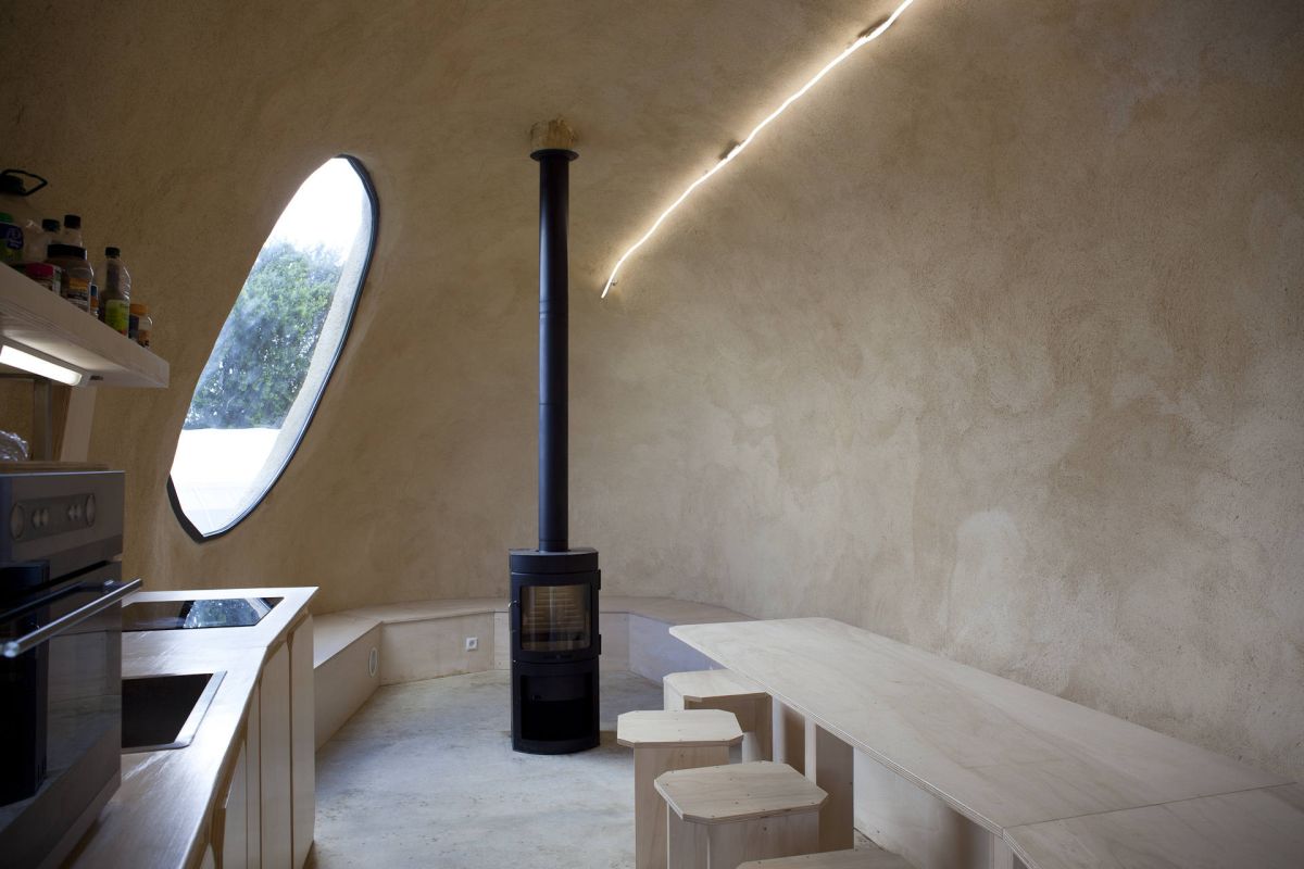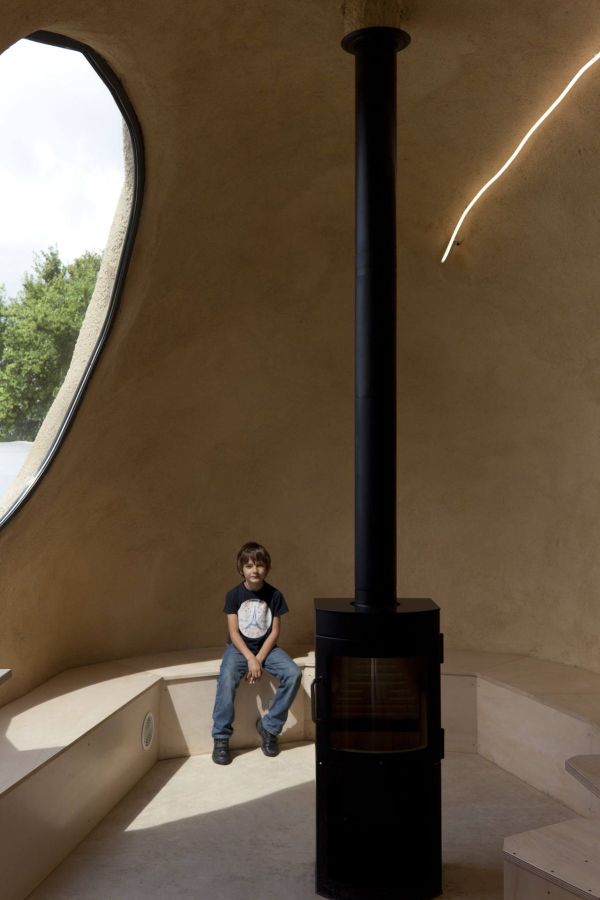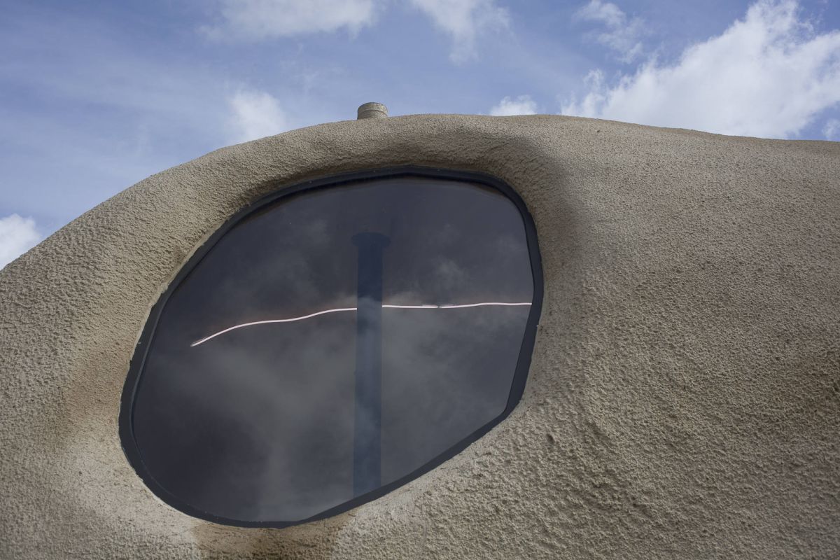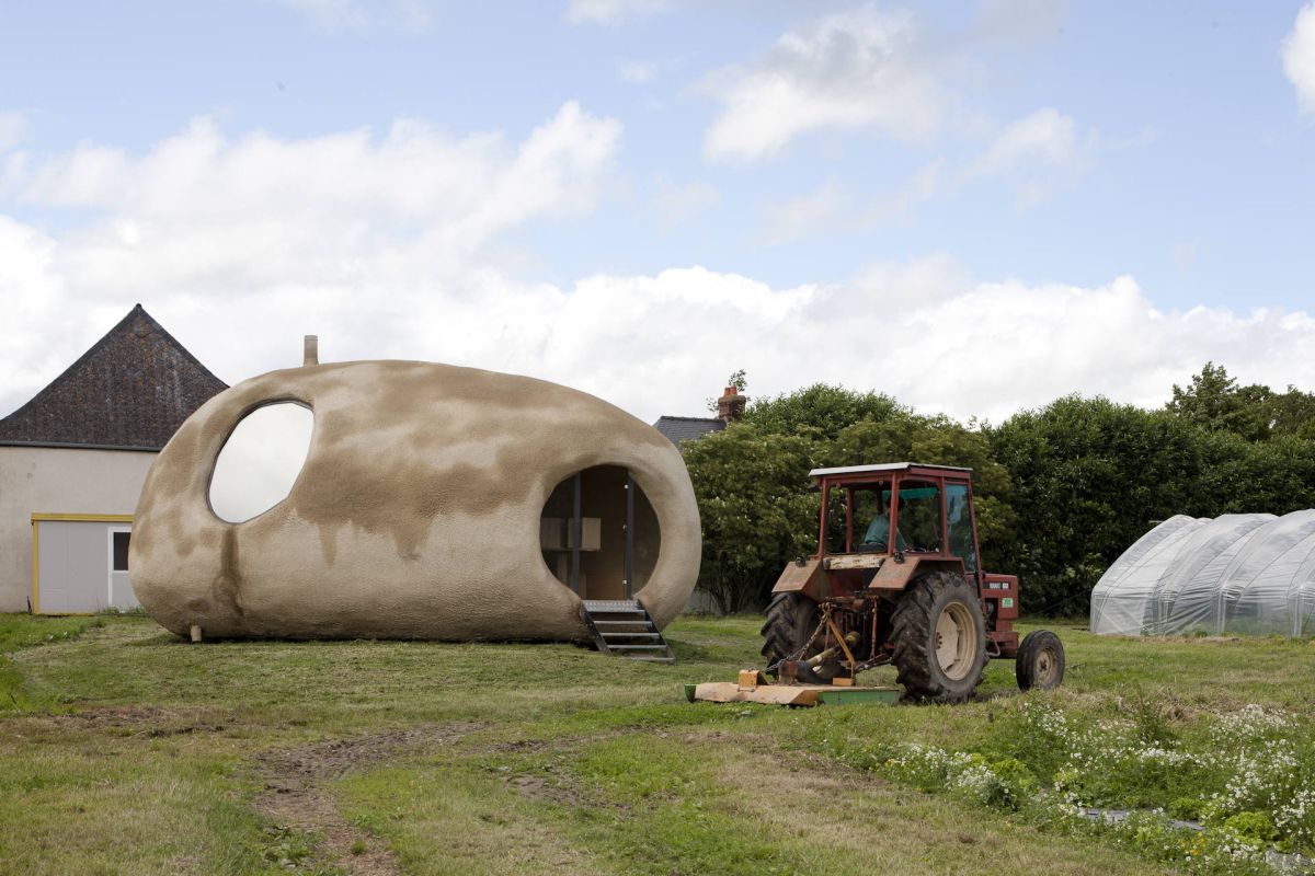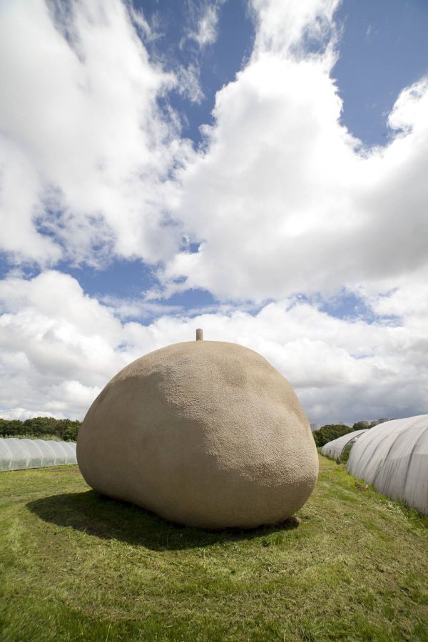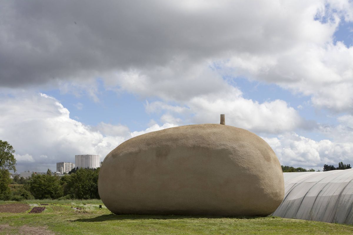 “Quand j’ai commencé à travailler sur ce projet, je faisais cuire des patates dans du papier aluminium à la braise. J’utilise régulièrement l’aluminium dans mon travail. Je me suis dit alors que la feuille d’aluminium entourant la patate pouvait être un abri, la structure de protection extérieure et que la patate avait la forme du cocon. La patate étant un légume avec une forme à la fois imprévue et élégante, je me suis dit que cette forme s’intègrerait bien à l’espace des jardins. Je tenais également à conserver cette idée de convivialité des patates au feu, à la braise, ce moment partagé entre amis. Souvent, dans mon travail, je déplace la fonction première d’un objet par un léger glissement. J’ai donc voulu garder l’idée du feu, de la chaleur dans l’image de la patate. Puisque le feu ne pouvait être autour, je me suis dit qu’il serait dedans. J’ai donc placé dans cet espace un foyer dont le tuyau sort de la patate, d’où le titre : “La Patate chaude “.”