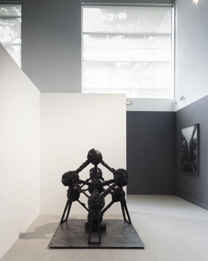 Recouverte de coquilles de moules, La moule atomique ne cache pas ni son ancrage géographique, ni sa dérision. Nicolas Floc’h puise au sens propre comme au sens figuré ses ressources sur le territoire, connu pour sa production et sa consommation conchylicole. L’allusion au travail de Marcel Broodthaers, artiste belge, semble également évidente, lui qui choisissait la moule pour sa puissance d’évocation, du jeu de mot sur le moule du sculpteur aux effets colorés et irisant de la coquille. On retrouve d’ailleurs dans le titre « la moule atomique », l’esprit humoristique et ludique du surréalisme. La désacralisation, le collage, le décalage, l’association incongrue, l’accident, la provocation, le cliché, la dissimulation… autant de stratégies chères à ces artistes.