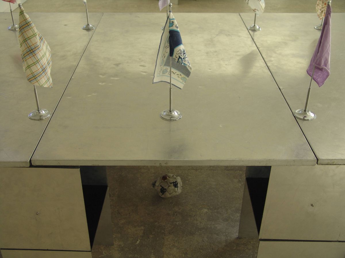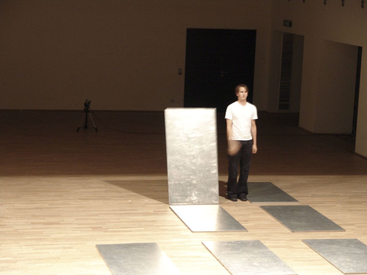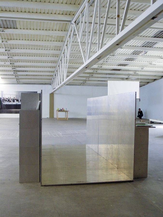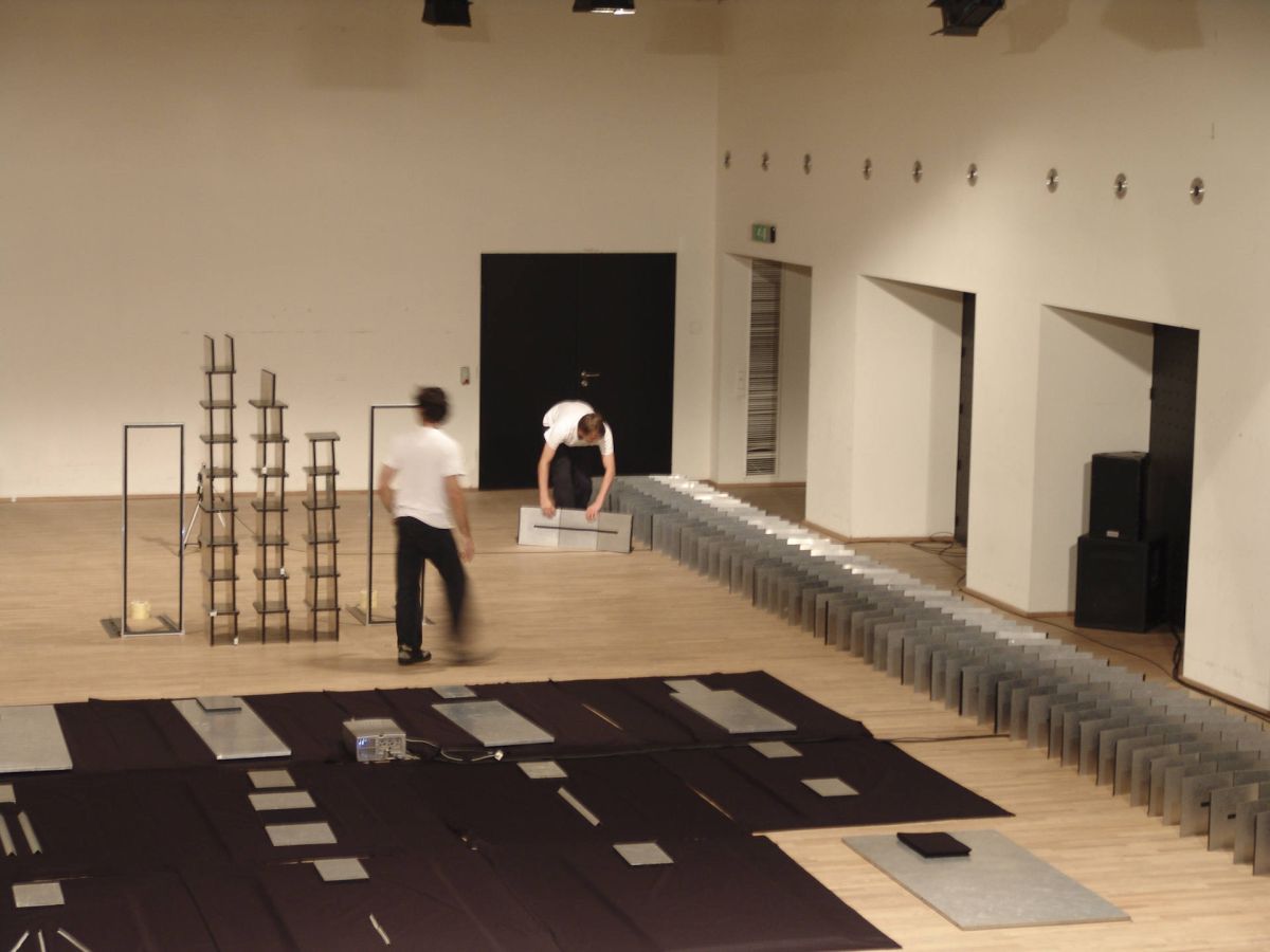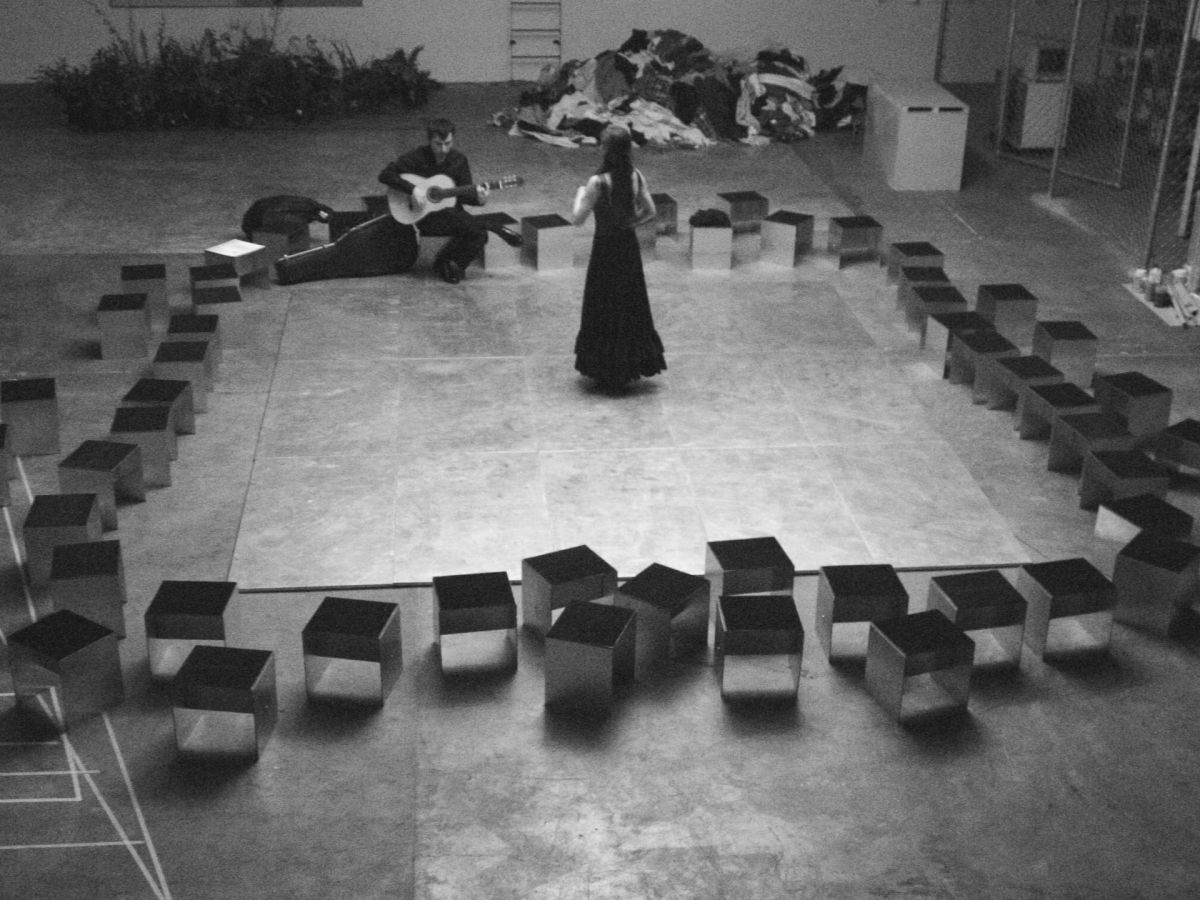 Inaki Bonillas a placé les plateaux au sol et les tabourets autour de cette scène. Il a invité Casilda Madrazo à danser le flamenco sur la structure avec la conscience que les talons des chaussures viendraient marquer définitivement les panneaux d’aluminium. La performance devient un geste pictural. La structure porte les marques de l’action.