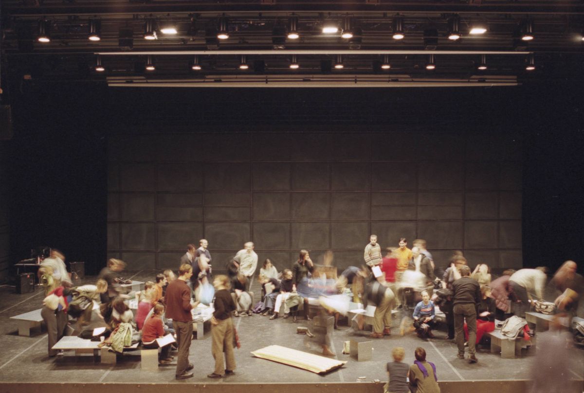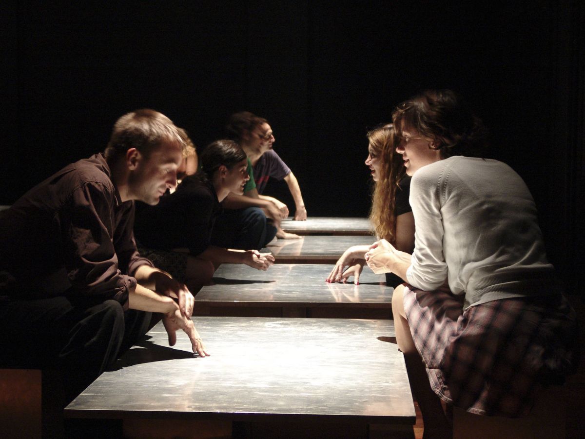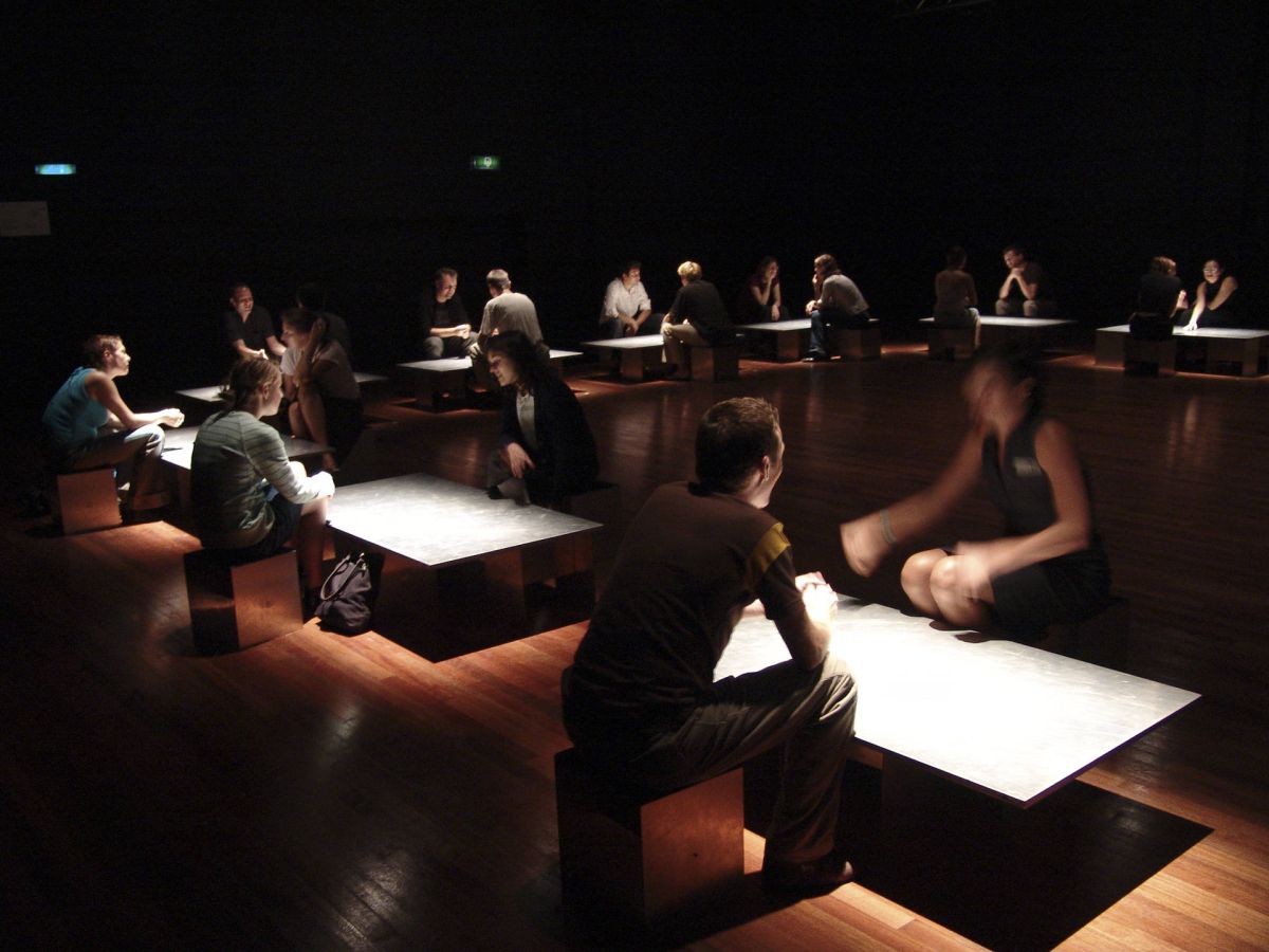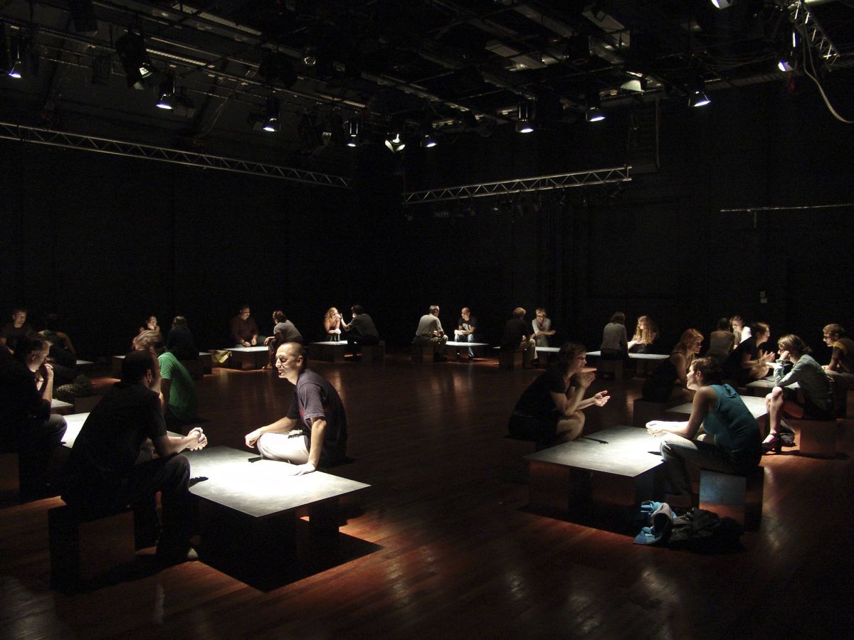 Les quinze panneaux de la structure deviennent quinze tables permettant d’établir un rapport particulier entre les acteurs et les spectateurs. Cette pièce pour quinze acteurs et quinze spectateurs propose une fiction réinventée à chaque représentation. Le spectateur est immergé dans l’action, il se trouve dans l’espace du jeu.