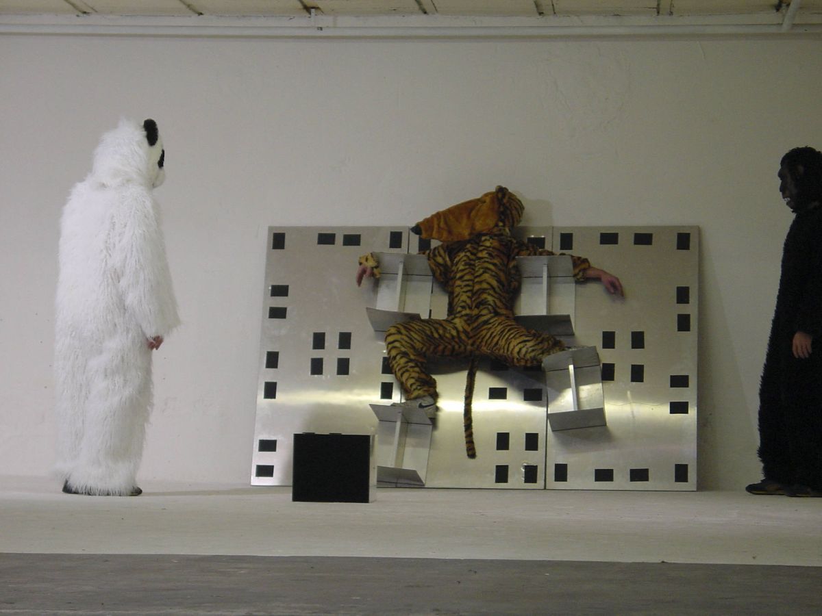 L’agencement de départ des modules crée un univers minimal. Les trois intervenants s’approchent de la caisse transformée en étagère et revêtent des peaux d’animaux. Les premiers déplacements sont lents, puis les personnages commencent à déconstruire les éléments, les peaux deviennent des vêtements de travail. Lentement, la construction minimale bascule.