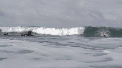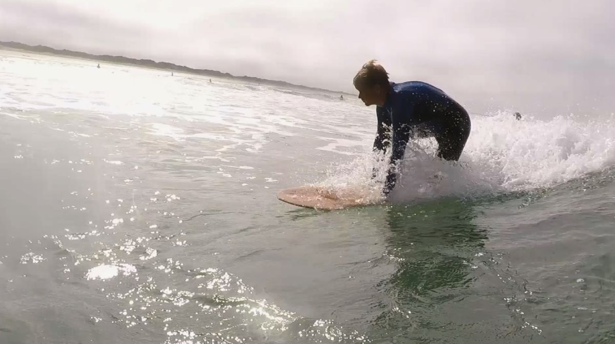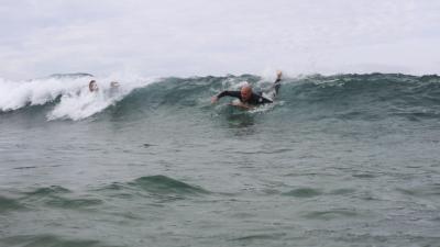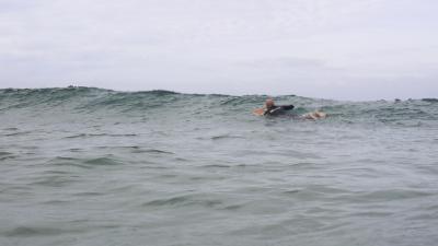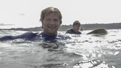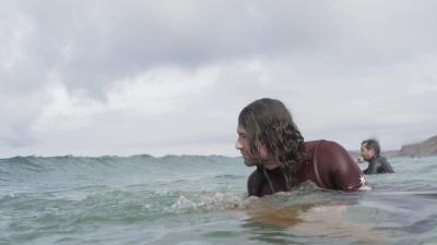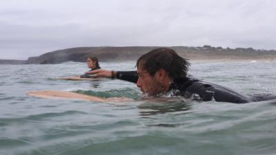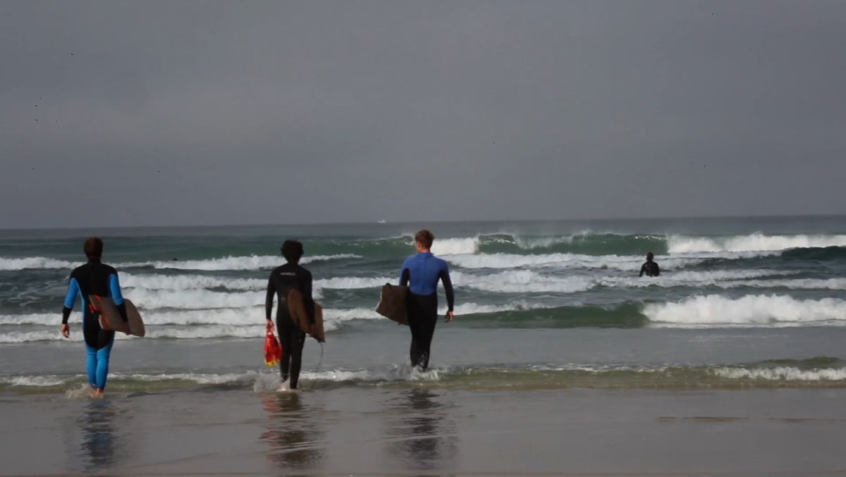 Séquence 4 - Spot de Surf, Côte bretonne Le banc est installé en haut de la plage. Les personne du groupe arrivent, certains s’assoient sur le banc, d’autre se changent. Une fois que tout le groupe est prêt, tout le monde se rassemble devant le banc puis part à l’eau pour tester les planches. Des plans d’ensembles permettent de voir le groupe. Il sont entrecoupés de plans serrés montrant individuellement chaque participant ainsi que des vues rapprochées des surfeurs depuis l’eau.