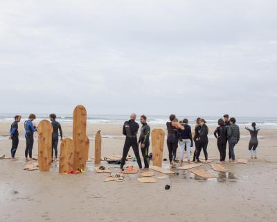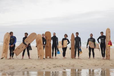 Avec le shaper d’alaia Xavier Moulin alias Xalaia et Laurie Peschier-Pimont, Gabriel Haberland, Benoit Marie Moriceau, Edgar Flauw, Anais Touchot, Laurence Perrillat, Antoine Dorotte, Eva Taulois, Margaux Germain, Martin Bachelier, Corentin Vitre, Leila Rose Willis, Esteban Richard.