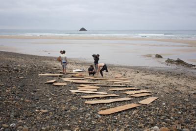 Ensemble, à partir d’un arbre, un Cèdre Rouge de 5m de Long et 60 cm de diamètre nous fabriquons des « alaia » et « paipo » (surfs traditionnels hawaiiens). Le coeur de l’arbre est conservé pour la réalisation d’un banc qui servira à regarder le film « surfer un arbre » à Passerelle Centre d’art contemporain, Brest.