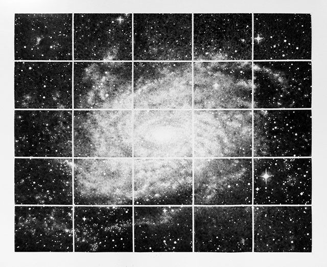 Avec des tampons encreur, une multitude de gestes et de chiffres, j’ai dessiné une image numérique de notre Galaxie.