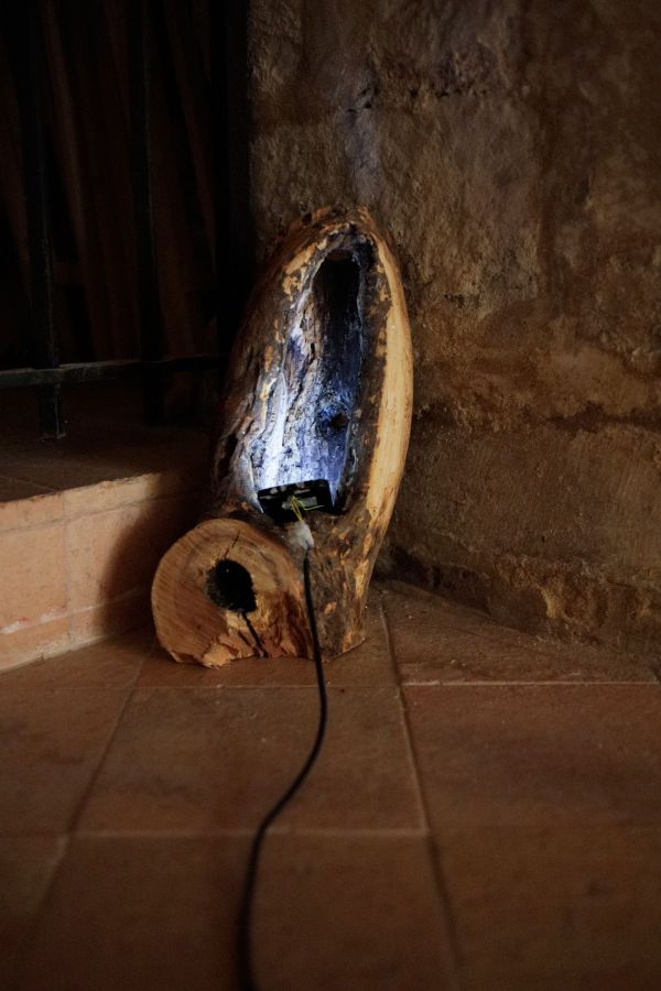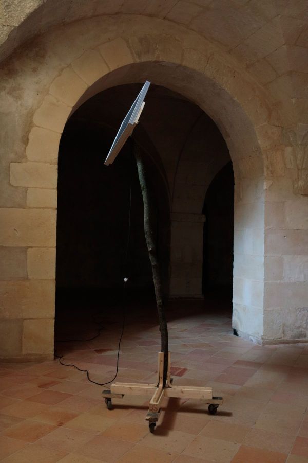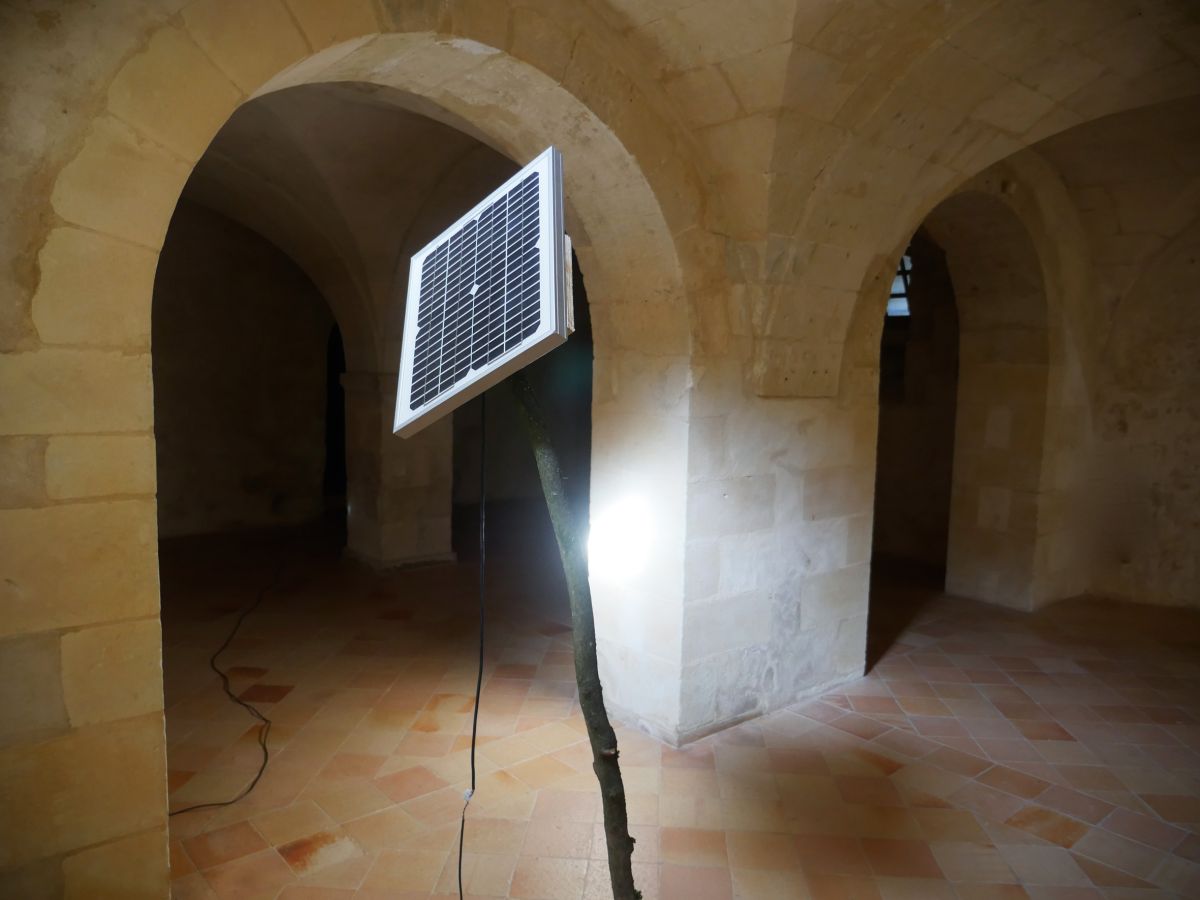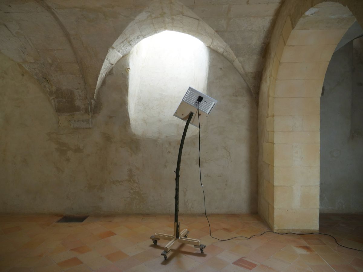 Les variations de l’intensité de l’énergie solaire captées par le panneau photovoltaïque sont retranscrites sur la nappe led d’un téléphone. Une tautologie, sans nécessité, juste un parcours fait de matériaux et de formes dont la lumière est l’origine et la fin.