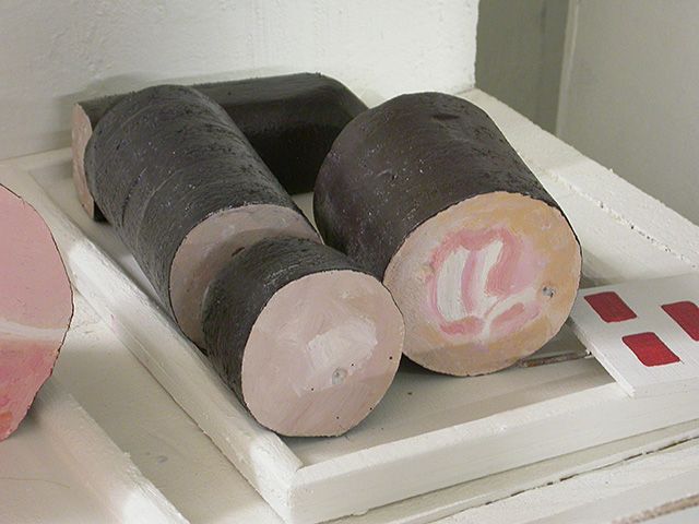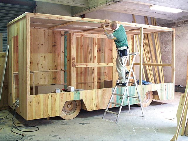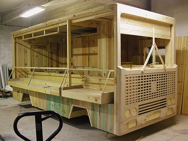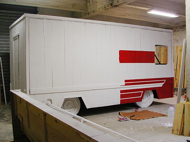 Réplique éch.1 d’un camion étalage de boucherie, voliges de sapin et bois divers peints, 510 x 300 x 200 cm. Coll. particulière.