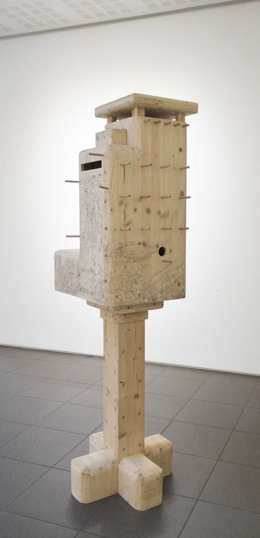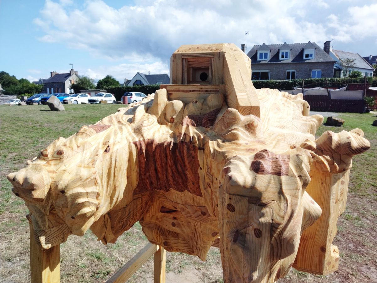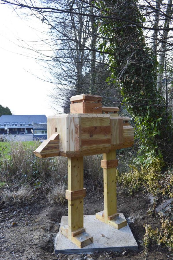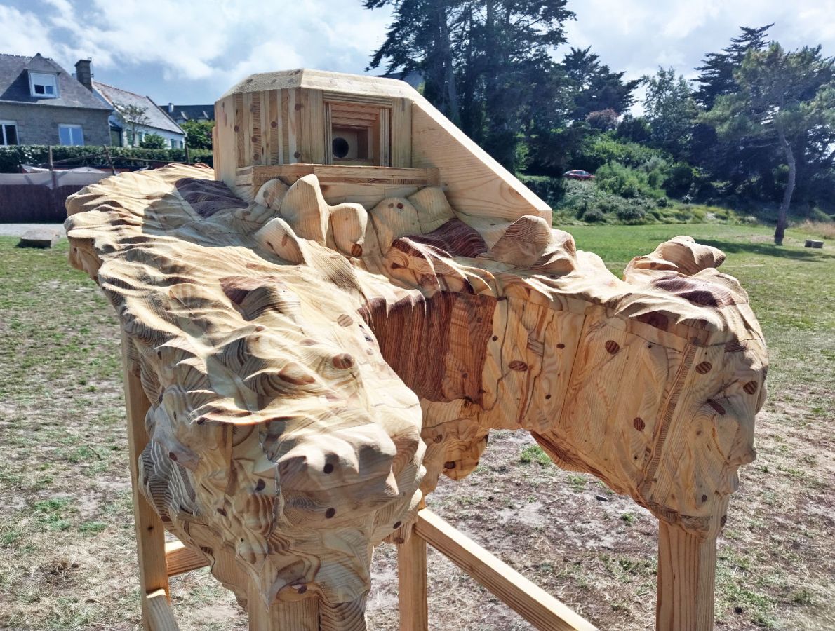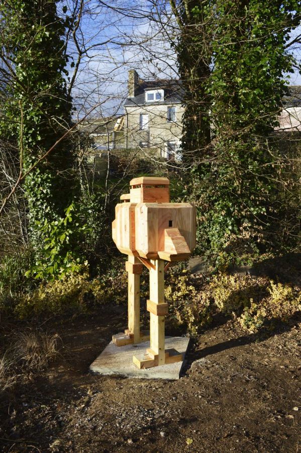Nichoir à oiseaux reprenant la forme d’un des blockhaus du Chef de l’Isle (Côtes-d’Armor), bois de récupération, 170 x 90 x 85 cm