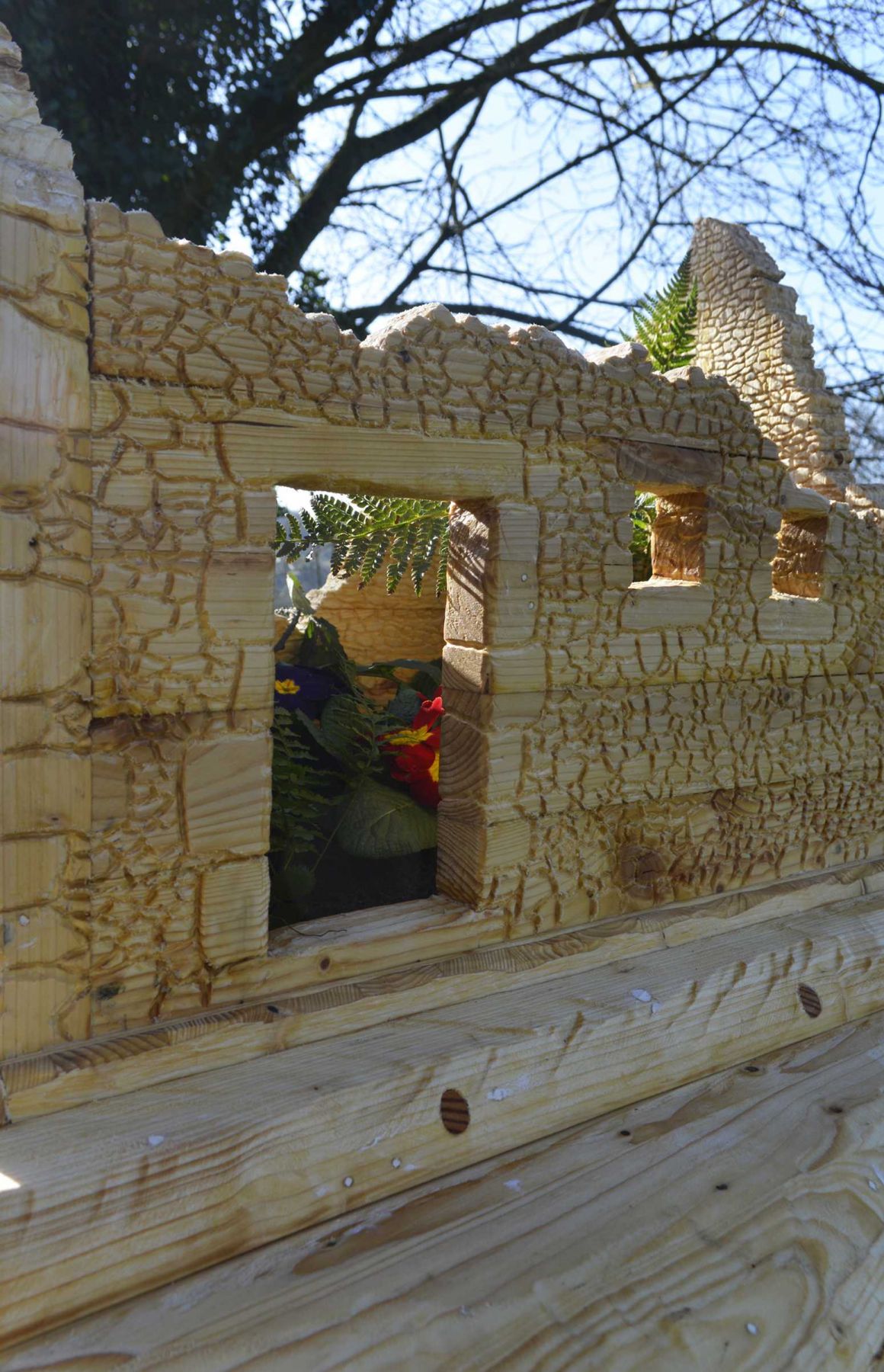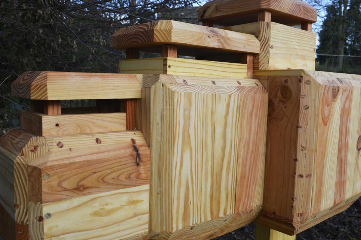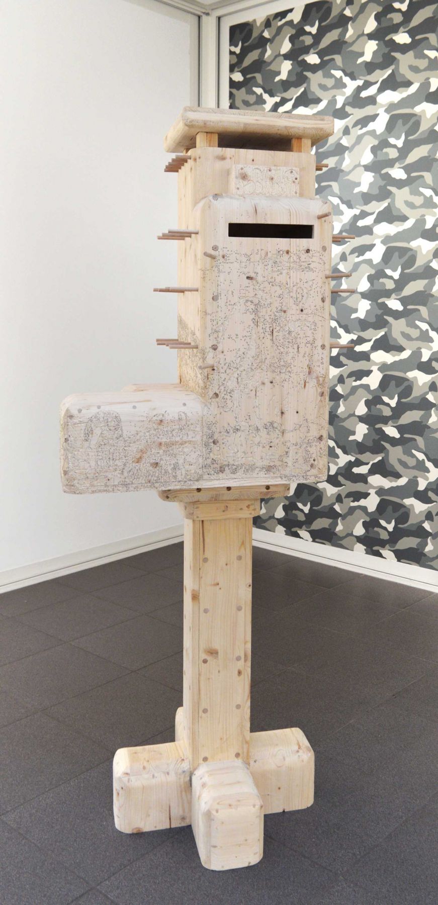 Nichoir à oiseaux reprenant la forme d’un des blockhaus du Chef de l’Isle (Côtes-d’Armor), bois de récupération, 170 x 90 x 85 cm