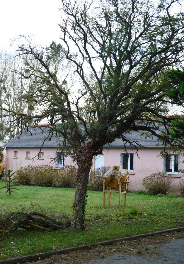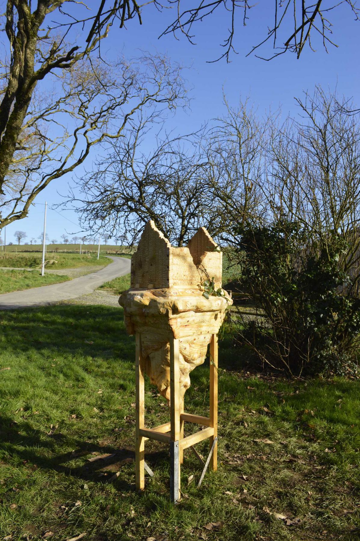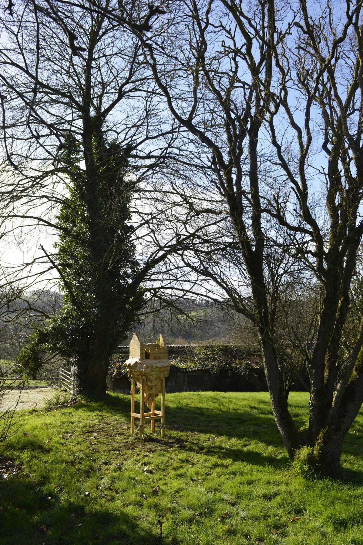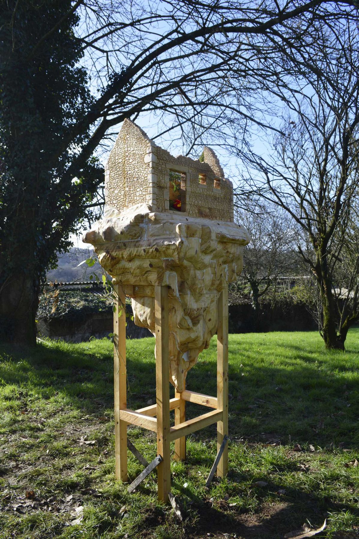 Nichoir à oiseaux reprenant la forme de la Tour du Bégo, batterie d’artillerie allemande de la Seconde Guerre mondiale (Plouharnel, Bretagne), bois, 92,5 x 61,5 x 46 cm (hors socle). Cour d’honneur de l’Hôtel Montfort Communauté, Montfort-sur-Meu. Production : L’aparté, Iffendic