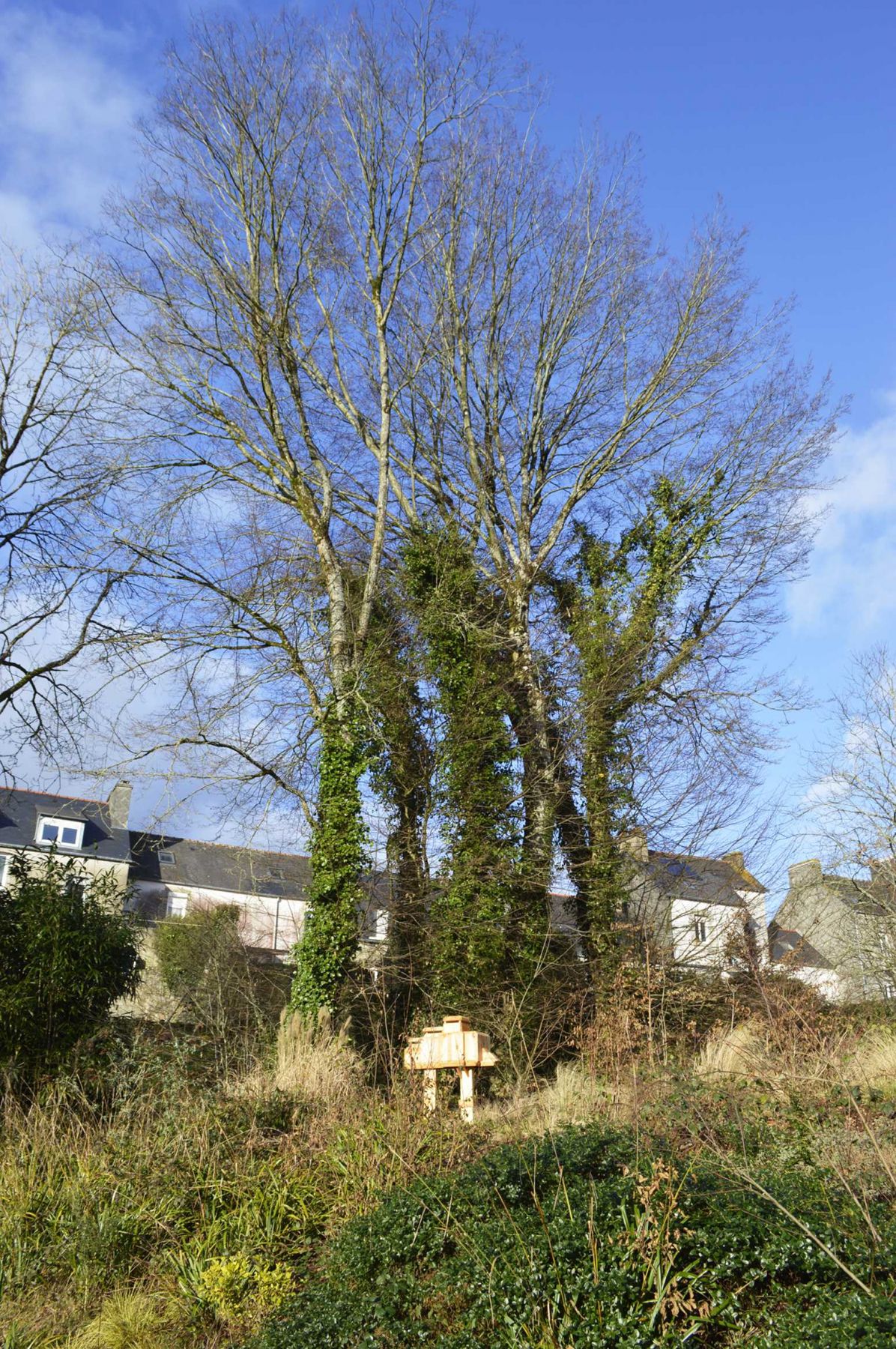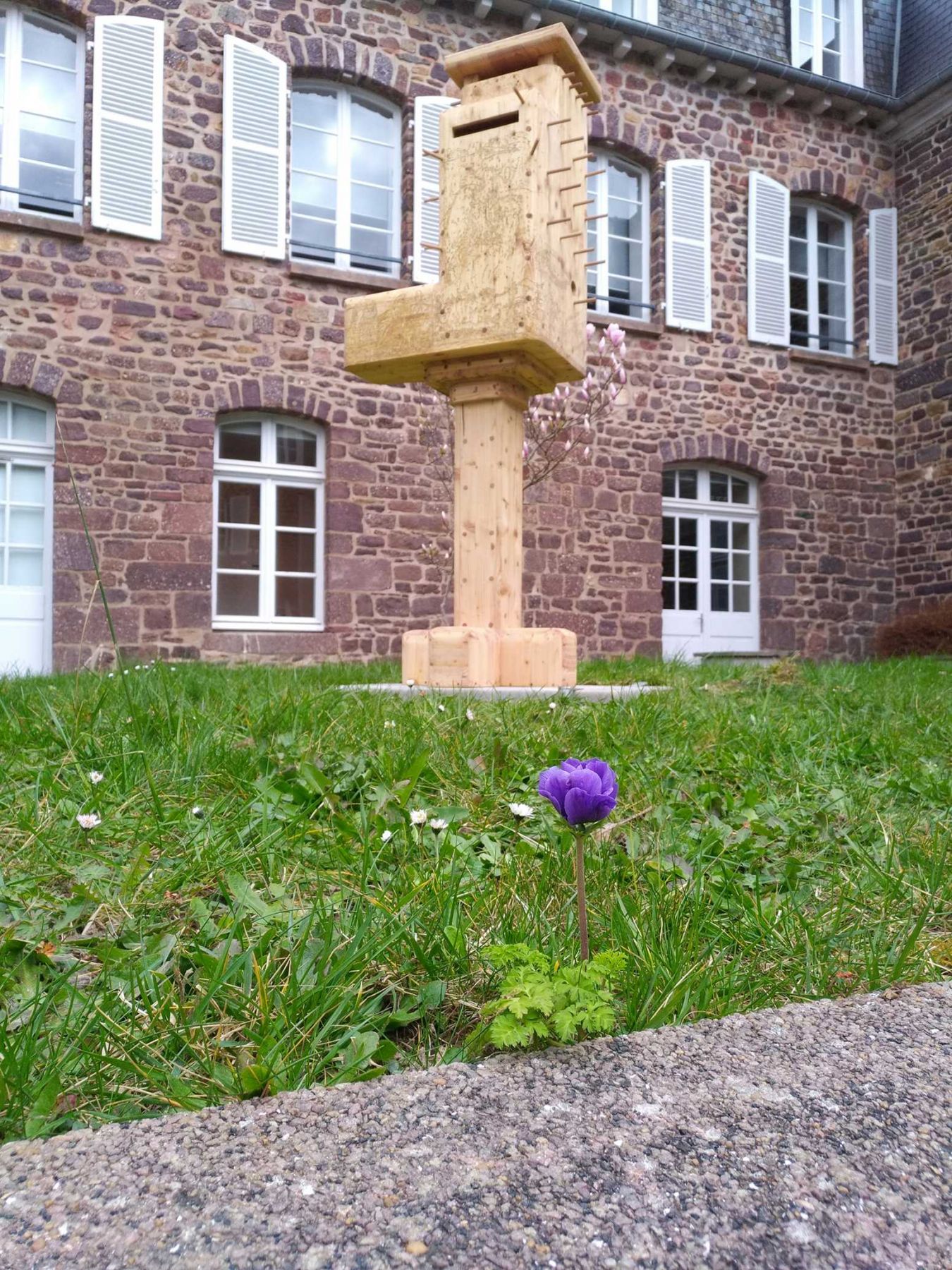 Nichoir à oiseaux reprenant la forme du Grand Blockhaus (Batz-sur-Mer), en collaboration avec les élèves du collège-lycée Notre-Dame de Campostal, Rostrenen. Bois, 70 x 70 x 160 cm (hors socle). Parc du collège-lycée Notre-Dame de Campostal, Rostrenen