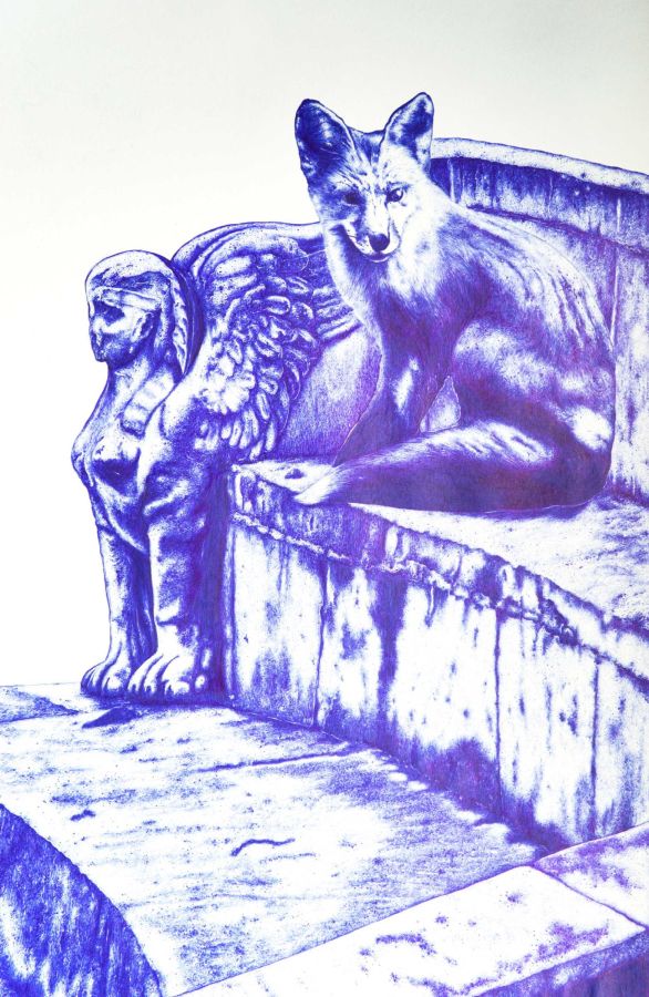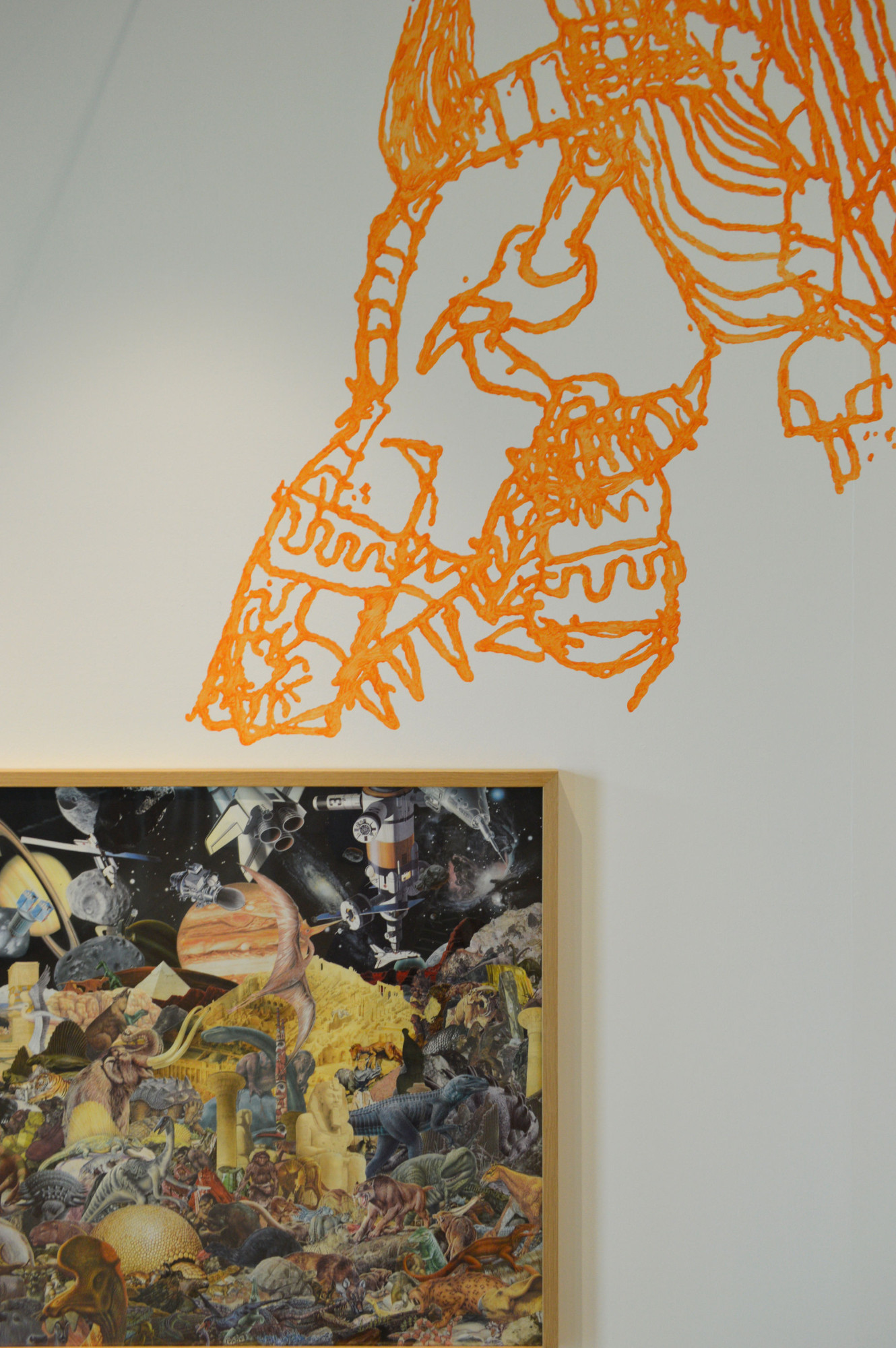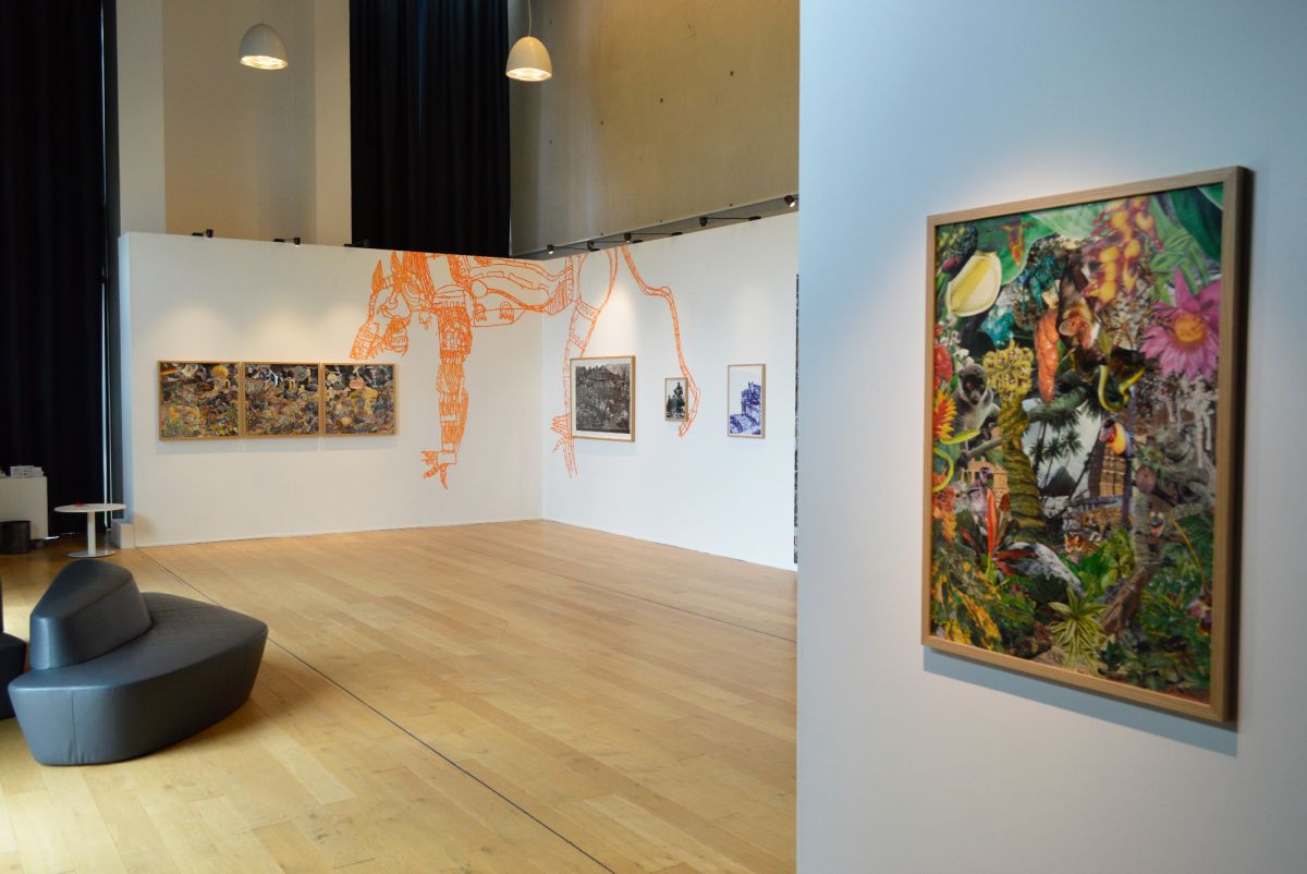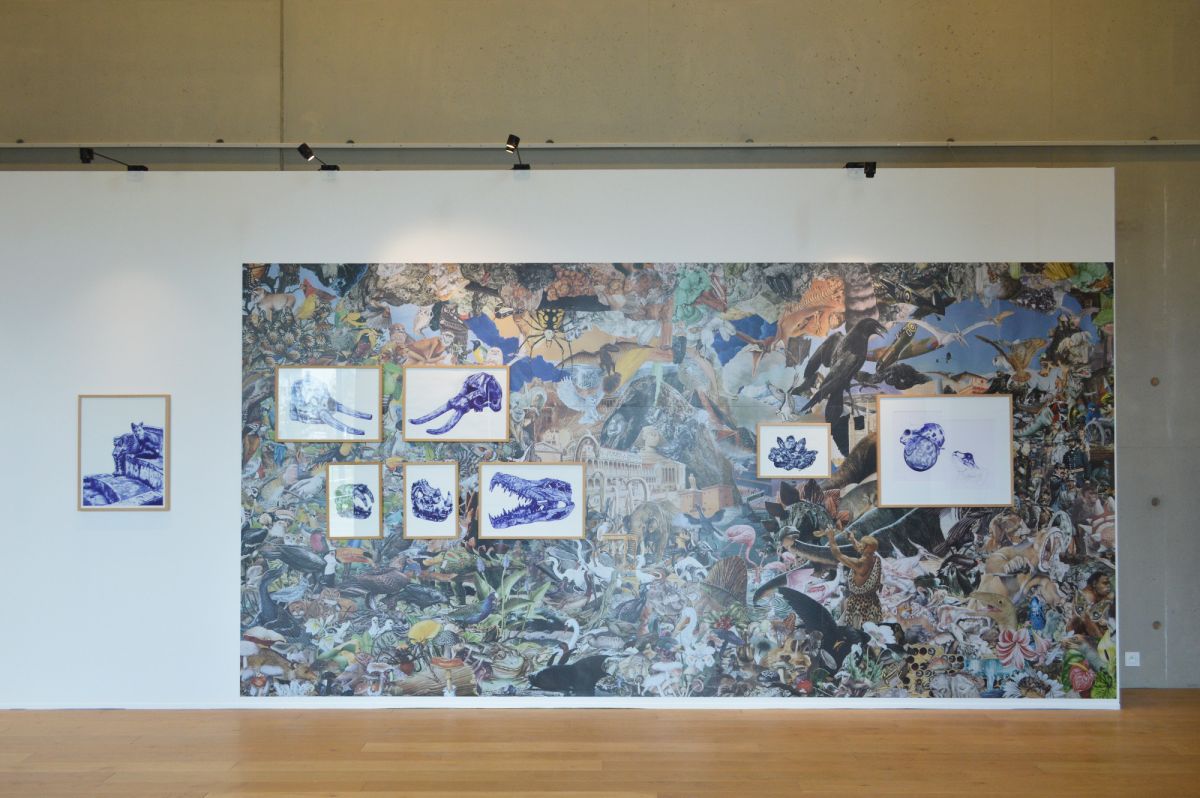 À l’image des terres que traversent le Singe-Roi et ses compagnons dans la fameuse Pérégrination vers l’Ouest, il est question de pays fabuleux et terribles. Des mondes cachés au fond des mers ou dans des gouffres souterrains, sur des îles lointaines ou au sommet de montagnes, hors de portée. Composites, ils empruntent à de multiples sources. Par le dessin, le collage ou la peinture, leurs images convoquent tour à tour la mythologie, la paléontologie, la minéralogie, les bandes dessinées américaines, des films de science-fiction, des tableaux classiques, comme des souvenirs d’enfance.