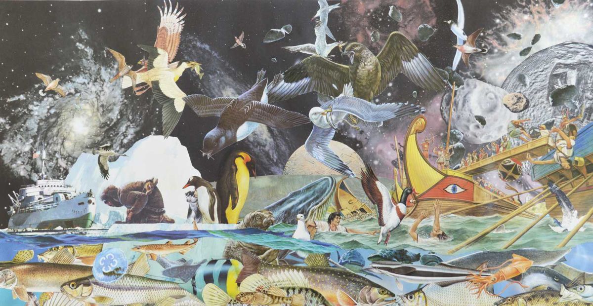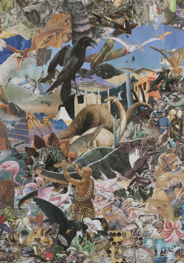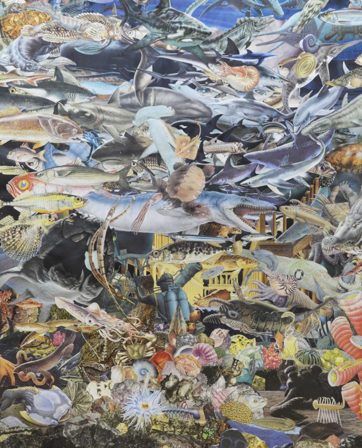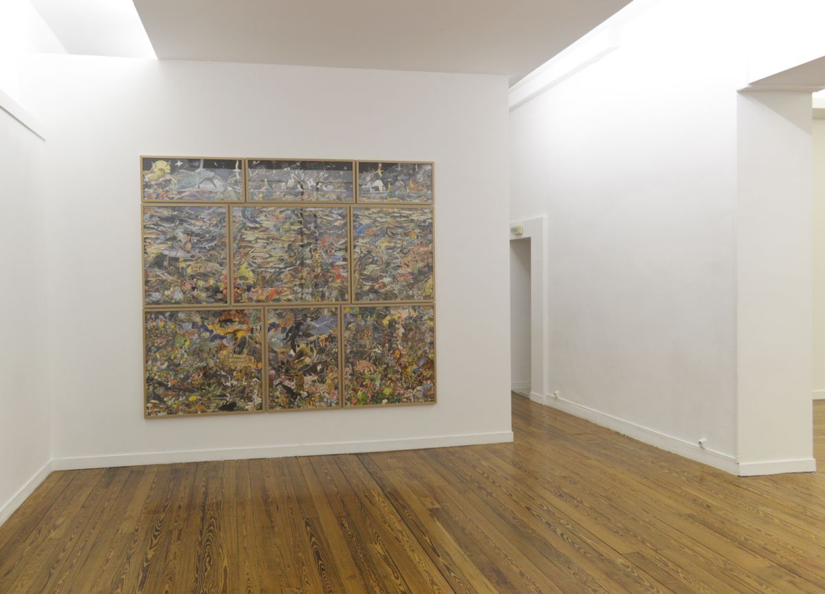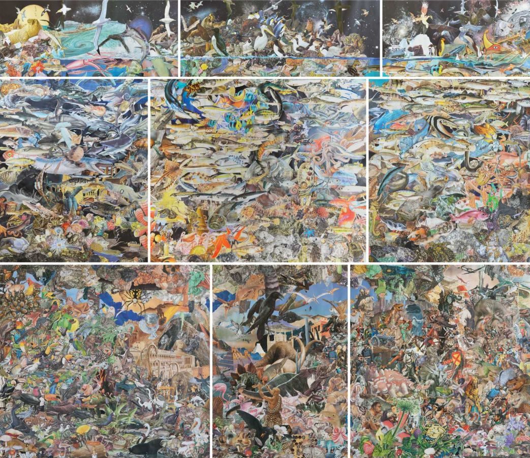 Illustrations découpées et collées, scotch, graphite, crayon couleur, encre, ensemble de neuf panneaux