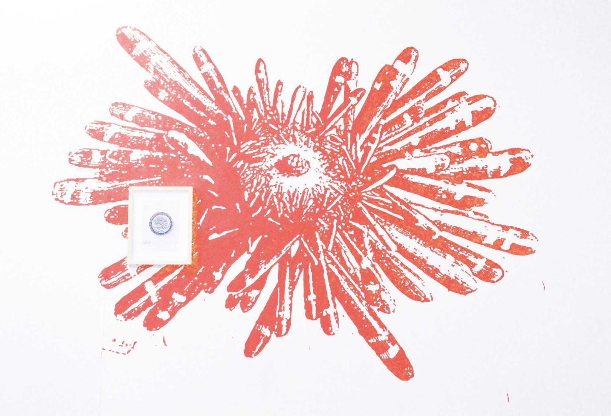 Peinture murale [Oursin régulier à longues baguettes, placé sur le dos (Heterocentrotus mamillatus L. Agassiz). Edmond Perrier, Les Explorations sous-marines, p.184], Rika Tanaka, Fin de pot, 2014