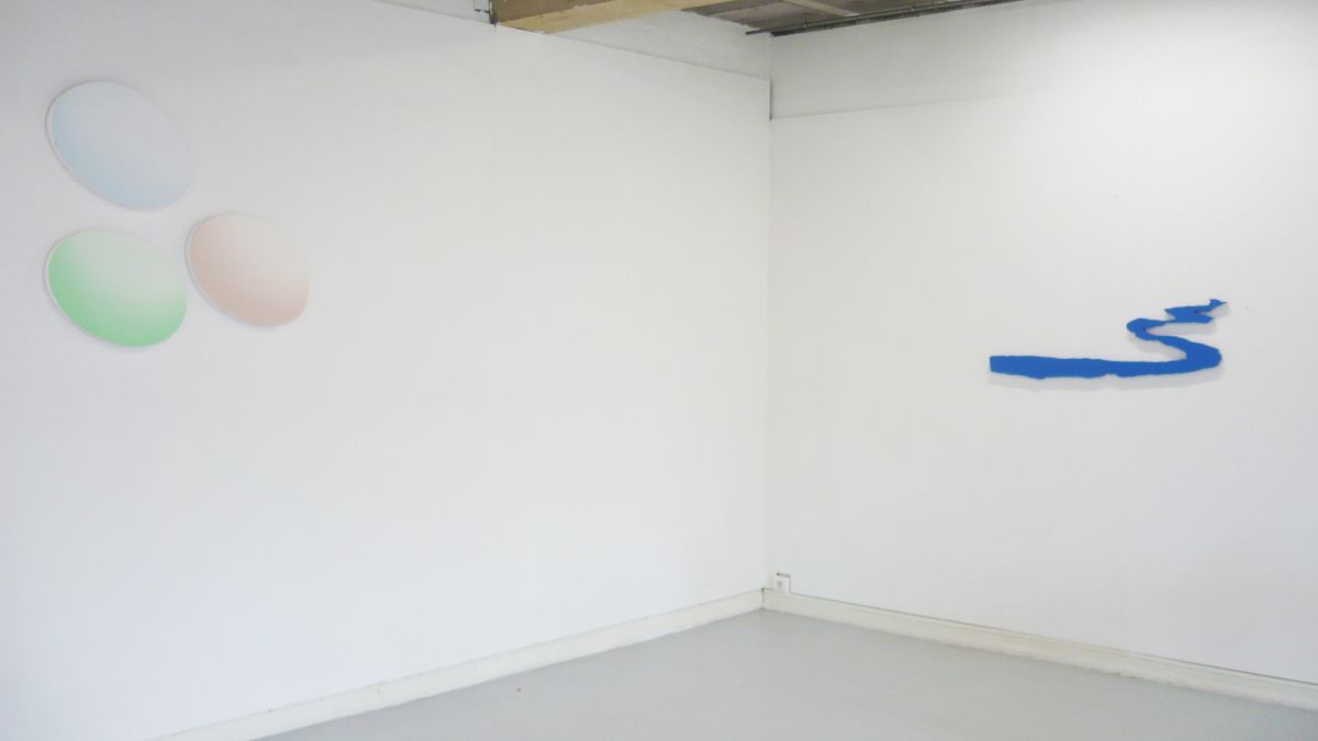 Vue d’atelier, installation murale, 9 reliefs en bois peints à l'huile, impressions jet d’encre, 250 x 340 cm