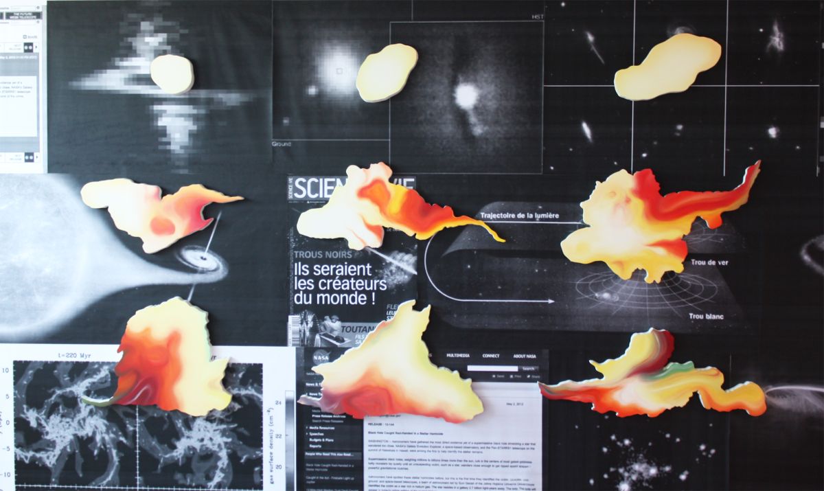 Ces abstractions figurantes, représentations de représentations d’abstractions, s’inscrivent dans un ensemble de réalisations concentrées autour de phénomènes cosmiques appartenant à une réalité que nous ne percevons qu’au travers des filtres de la photographie et de l’image de synthèse.