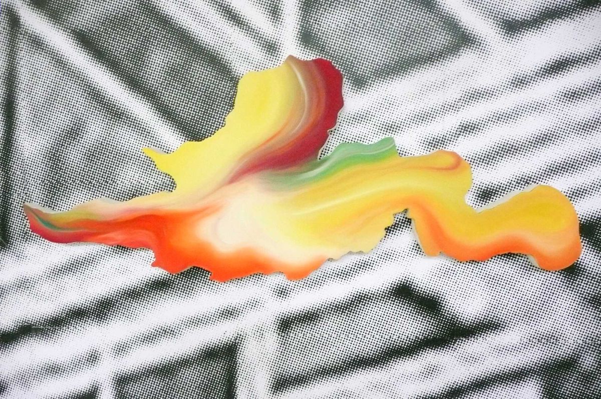 Tirées d’une vidéo de simulation éditée par la NASA en 2011 (NASA’ Swift Satellite Spots Black Hole Devouring a Star J1644+57), ces formes peintes disposées sur l’image d’une météorite, sont neuf moments de l’animation, neuf moments de l’évolution d’une forme de base, non pas une genèse mais une disparition.