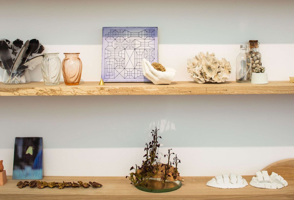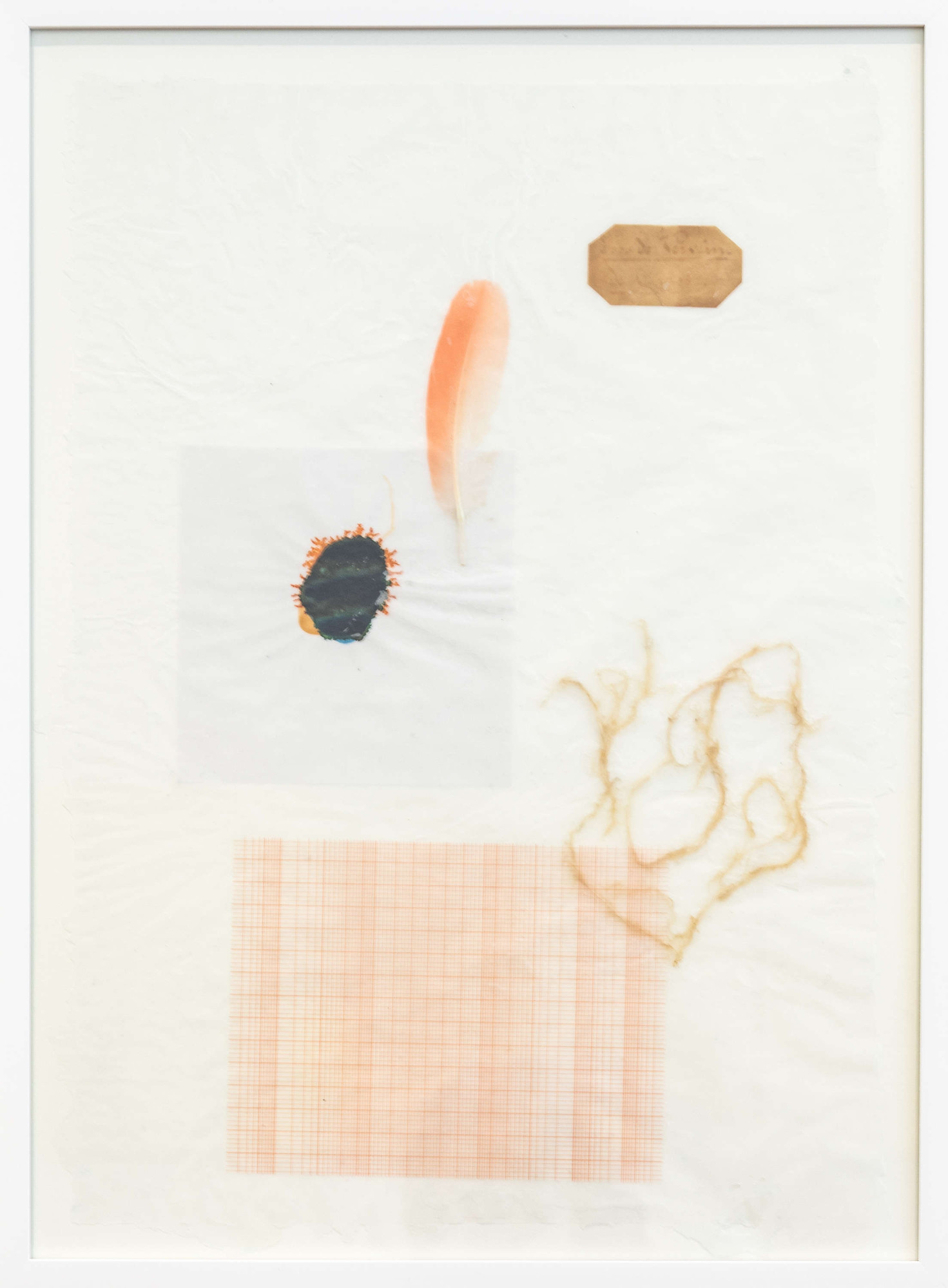 Étiquette, papier millimétré, bois, acrylique, plume de flamant rose, papier de soie et paraffine, 50 x 70 cm