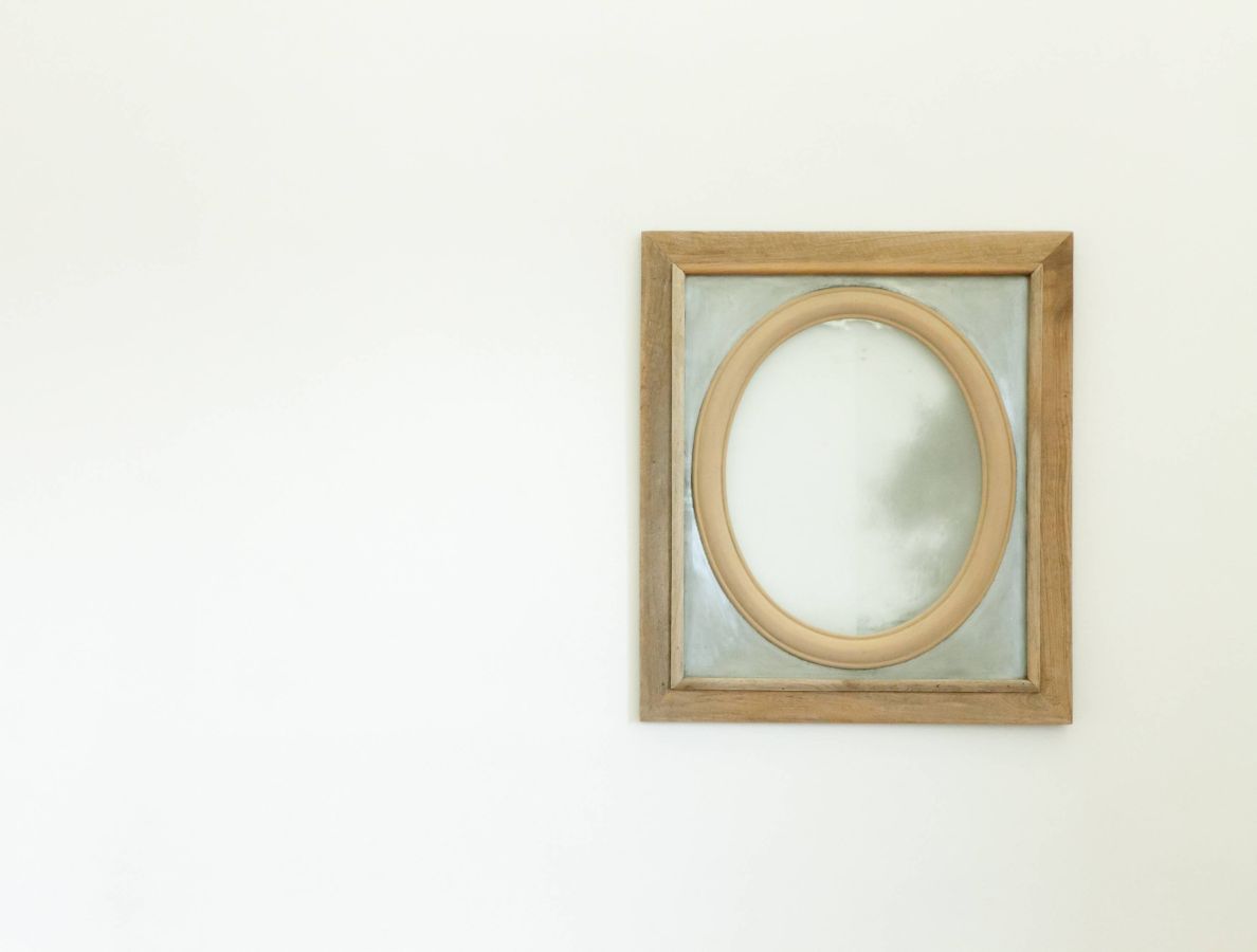 Miroir et son cadre en bois et en fer blanc décapés et poncés, 70 x 80 x 4 cm