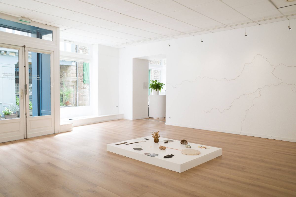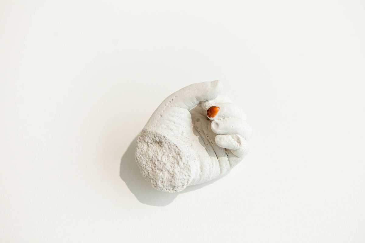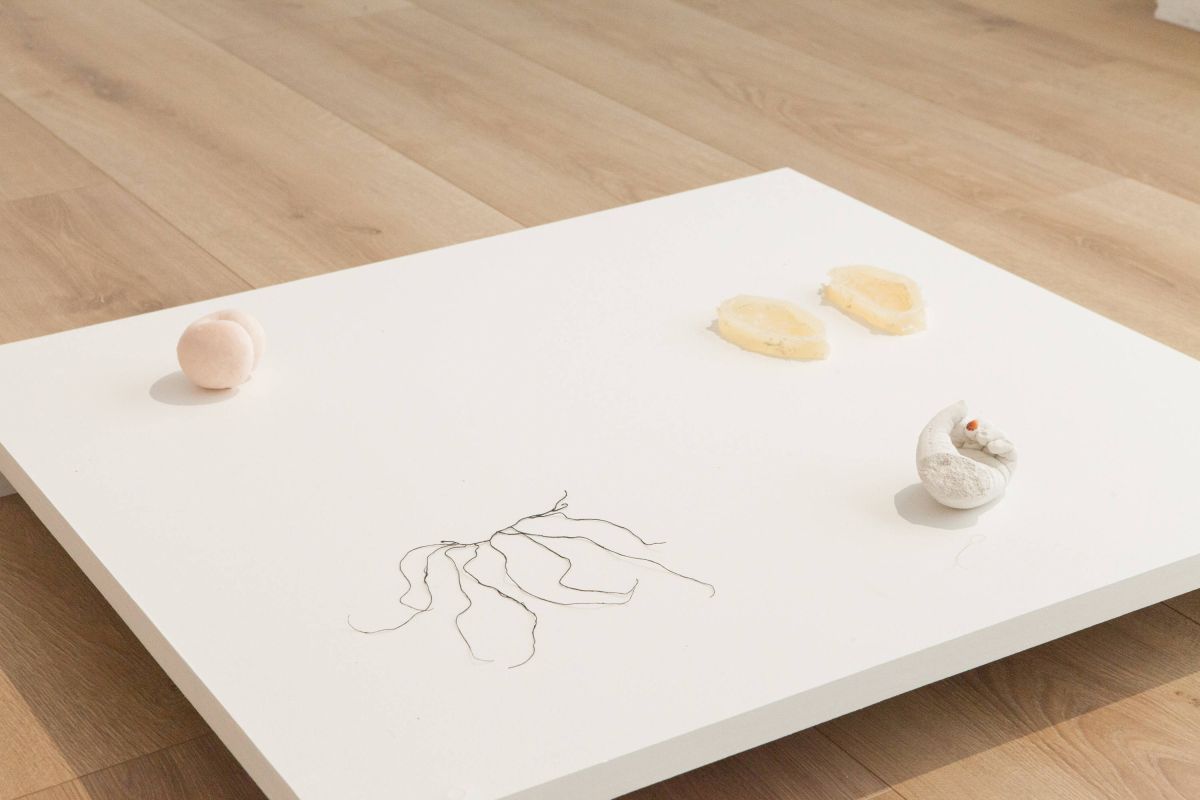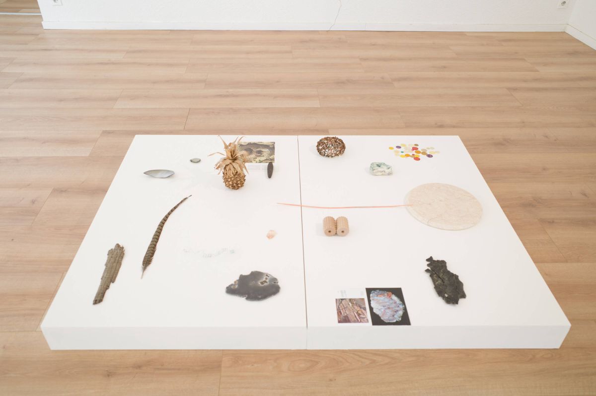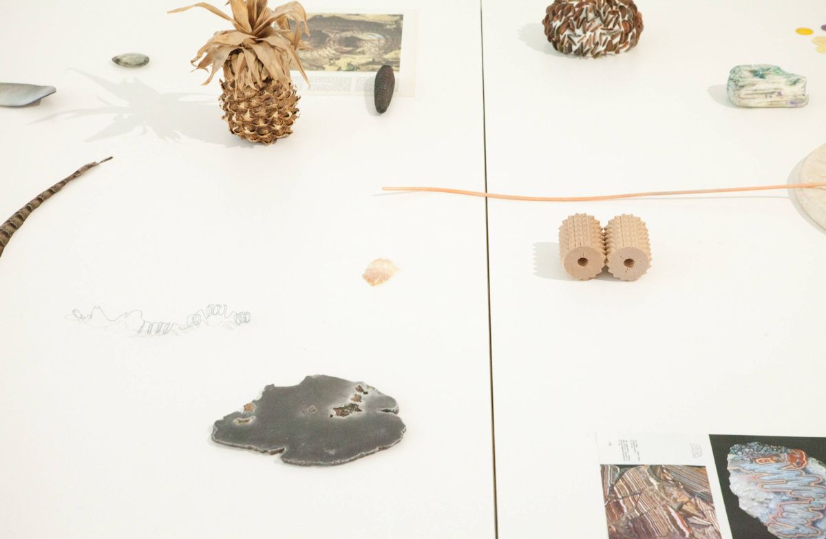 Plume de faisan, jetons en os teinté, rouleaux de massage, ananas déshydraté, pneu crevé, documents d’encyclopédie, écorce de bois, nacre, verre, poids de pendule coucou, savon usé, marbre rose, tige en plastique, pièce de monnaie rouge, argile, spirale en métal tordu, agate, coquillage.