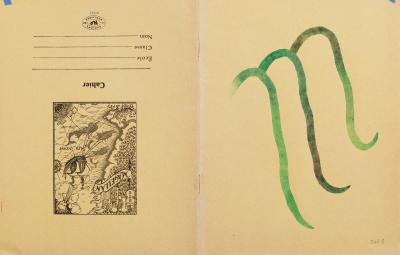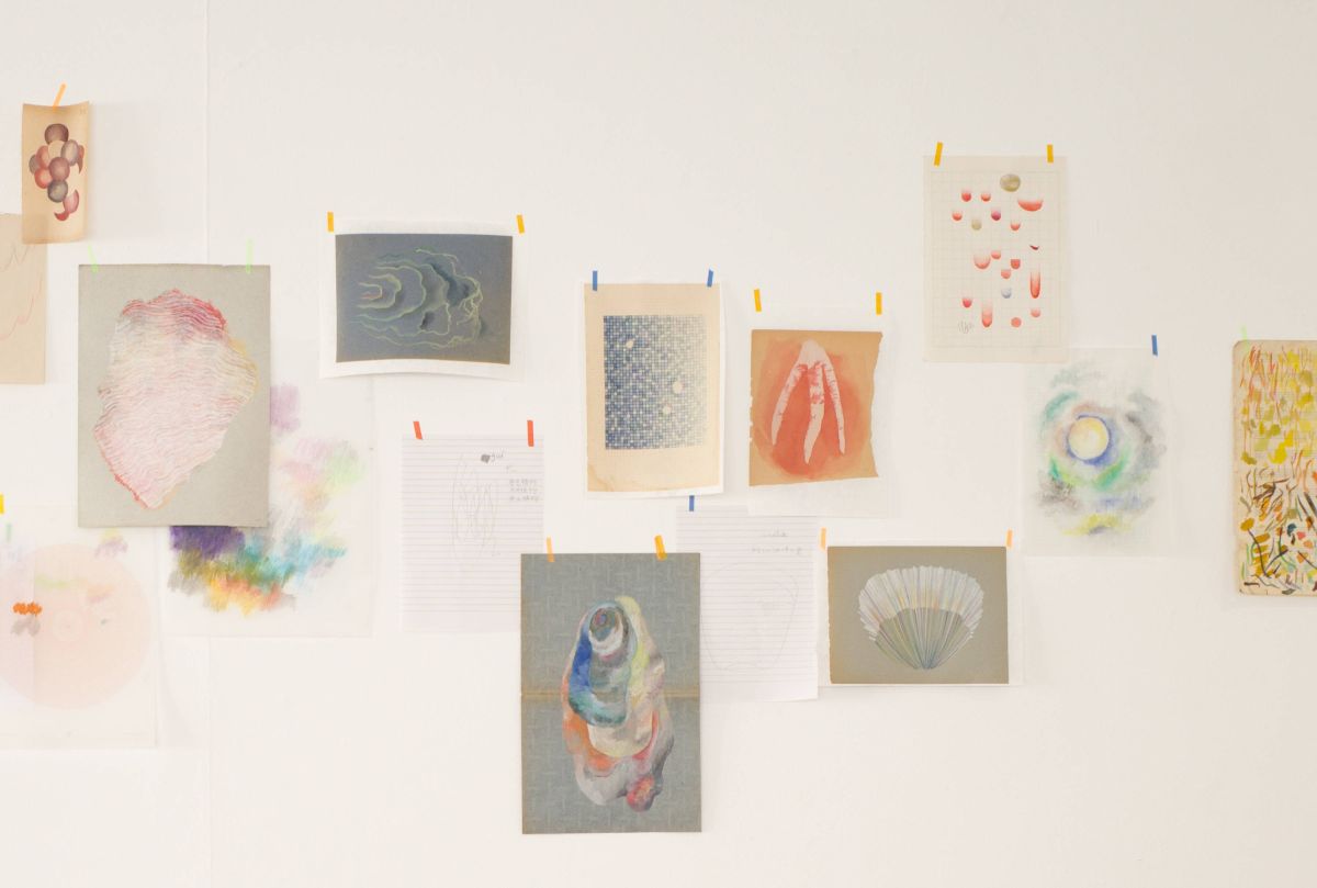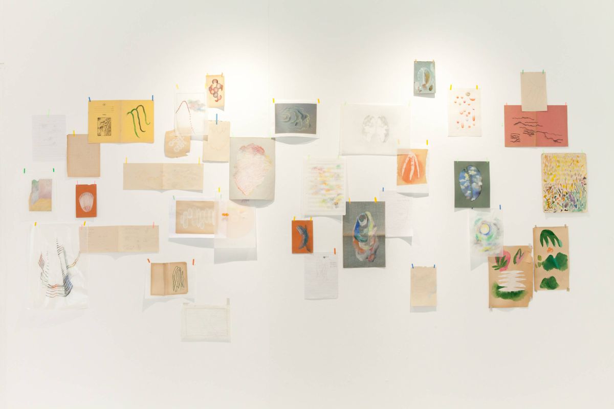Sans titre, acrylique sur mur, document d’encyclopédie, papier vierge, crayon couleur, papier calque, dimensions variables, 2025
