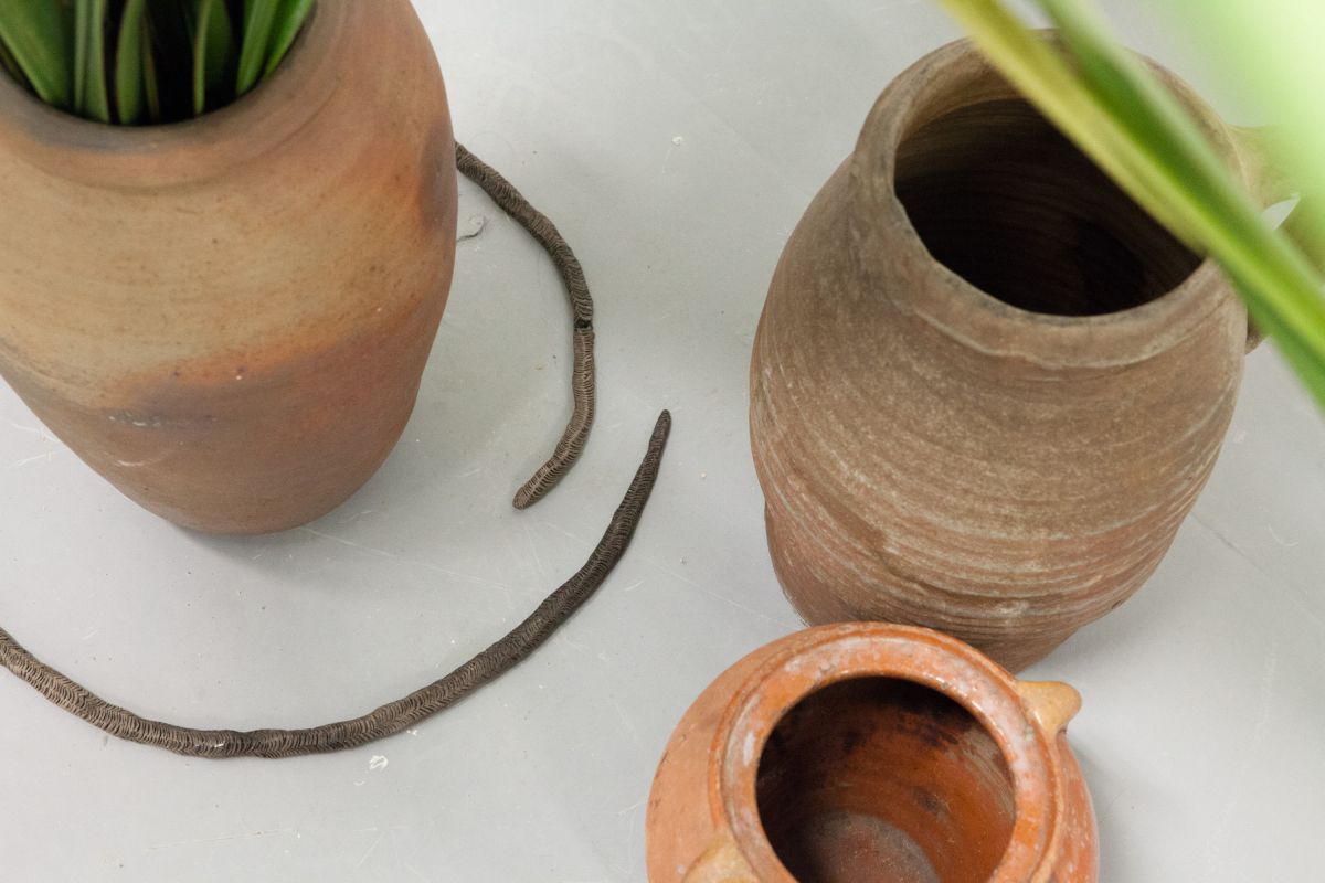 Terre cuite, pots anciens et plante sauvage, dimensions variables