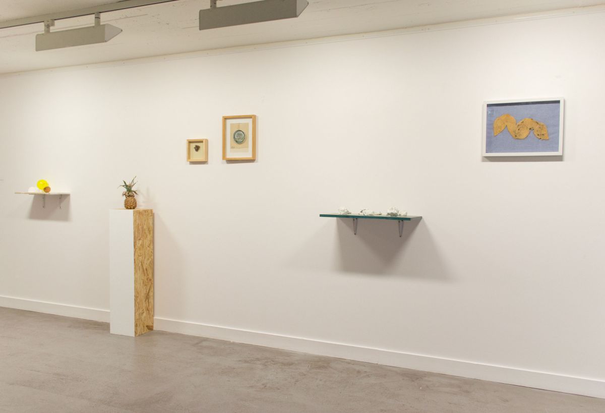 Technique mixte avec acrylique, pot en plastique, peau de melon, moulage en plâtre, pomme de terre desséchée, clémentine desséchée, ananas vidé et desséché, balle en plastique, bois.
