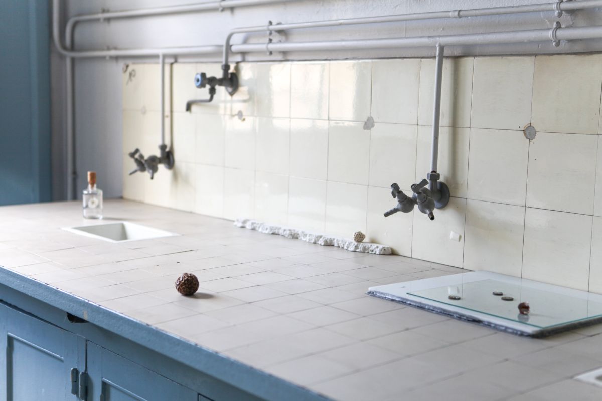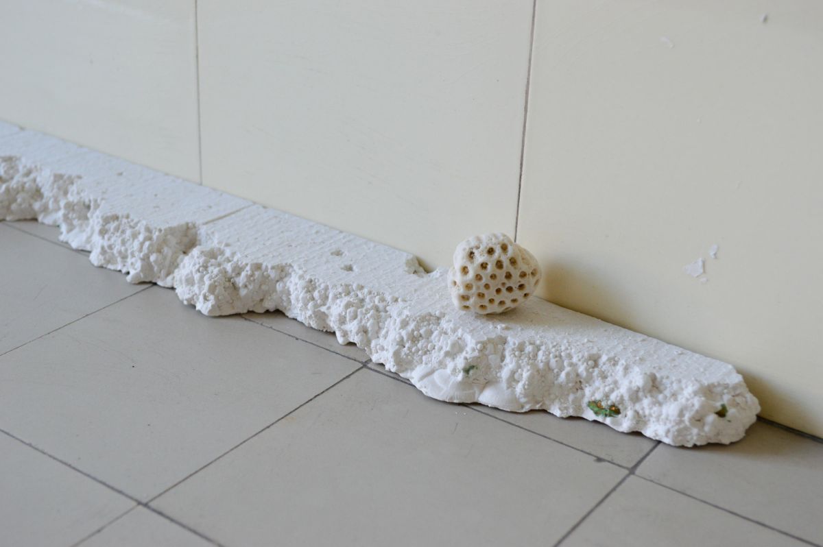 Plâtre, feuille d’or et fossile de corail, 2 x 62 x 6cm