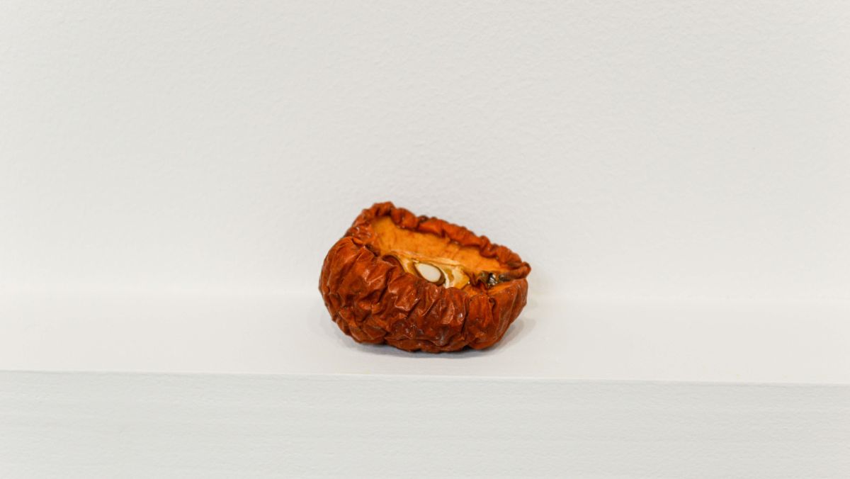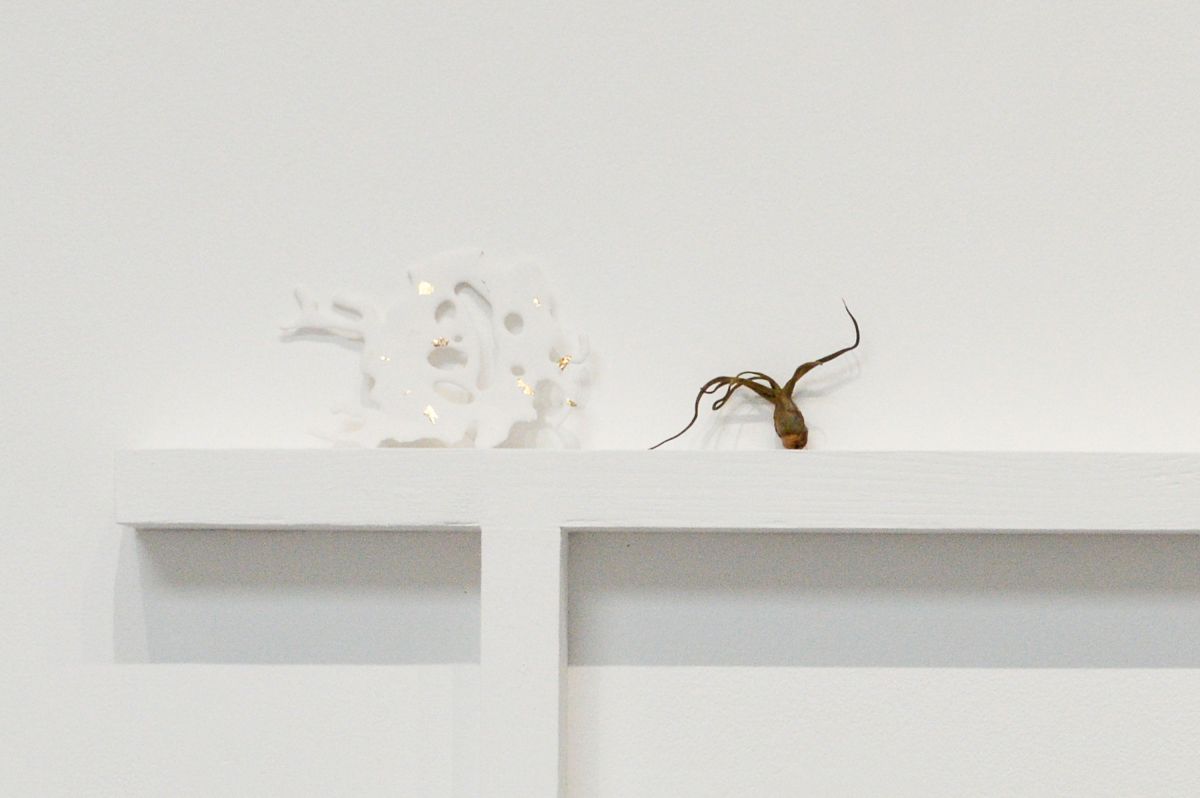 Assemblage des objets divers, technique mixte avec feuille d’or, plâtre, pomme desséchée, bois, pomme de pin, cure-dent, pate à fixe, plante fil à l’air, photo, verre. Dimensions variables.